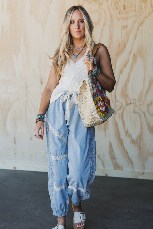 Floral Drift Embroidered Pants - Light Denim