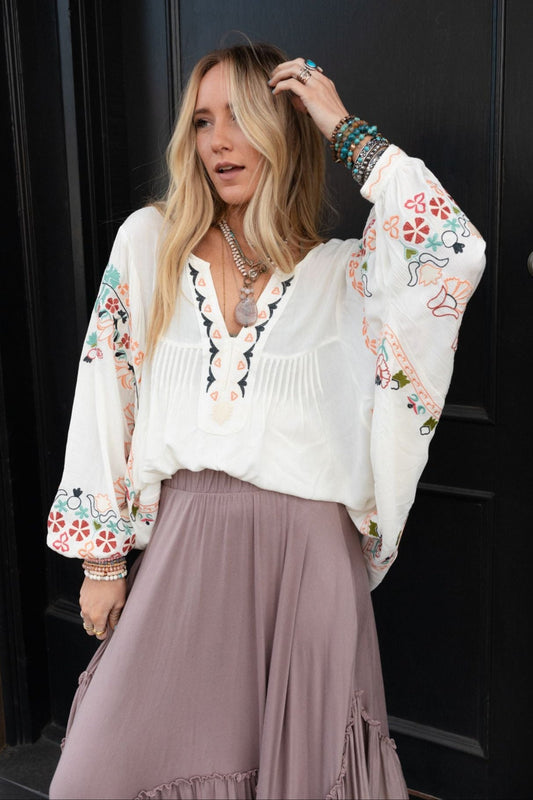 Frida Embroidered Dolman Sleeve Top - Ivory