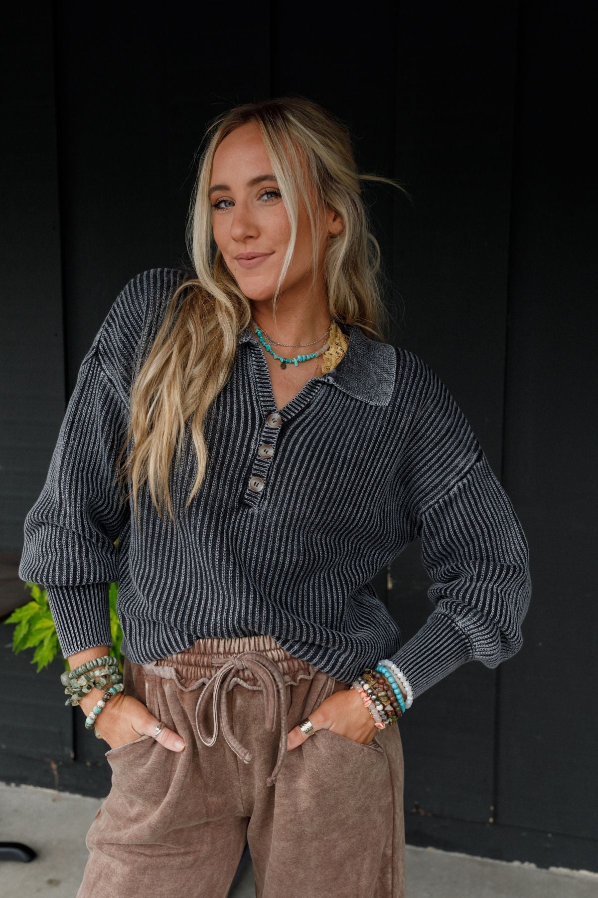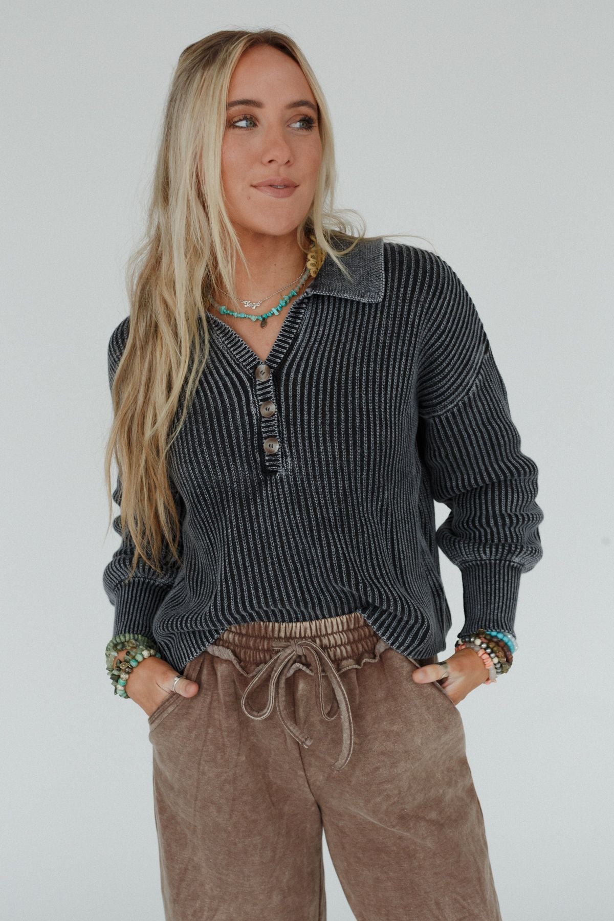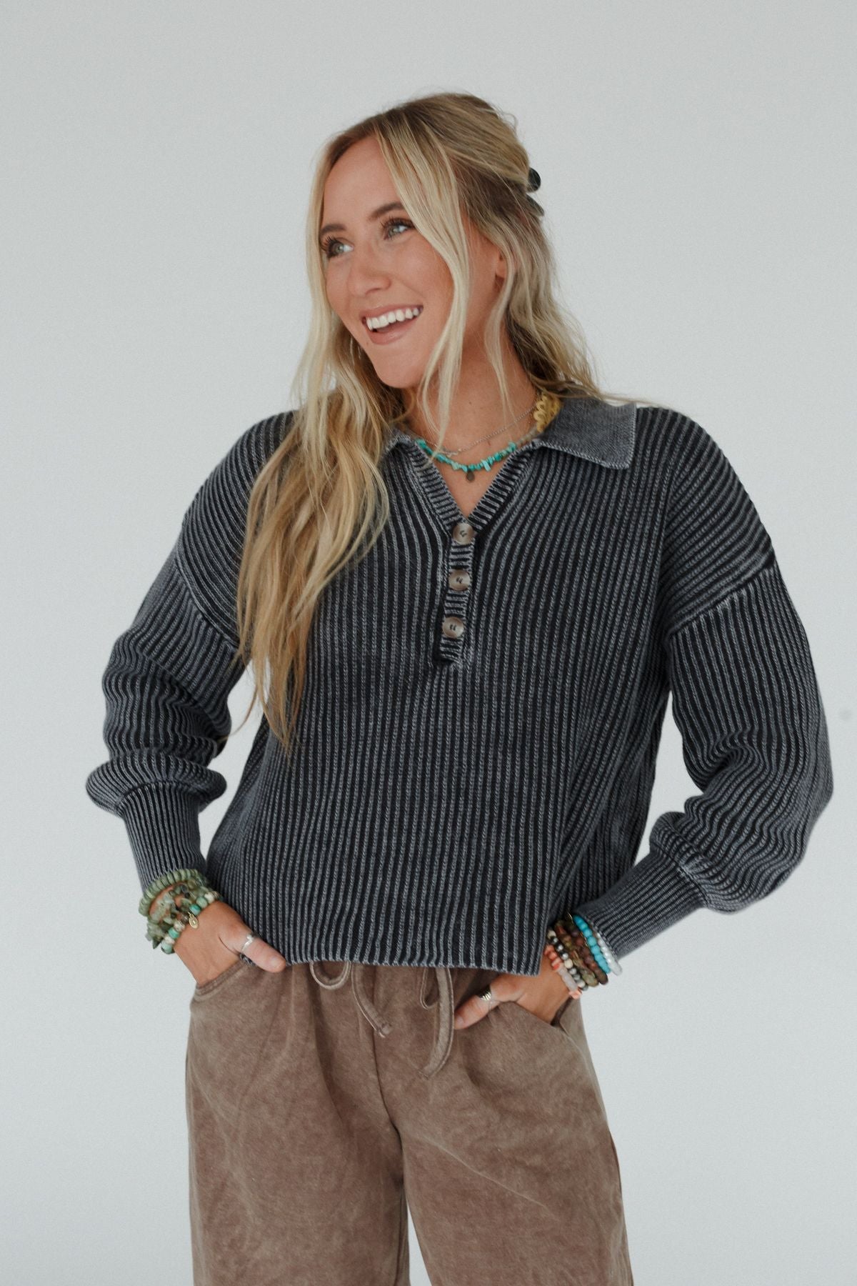 Classic collared Henley neckline with dropped shoulders, long sleeves and 3/4 button closure