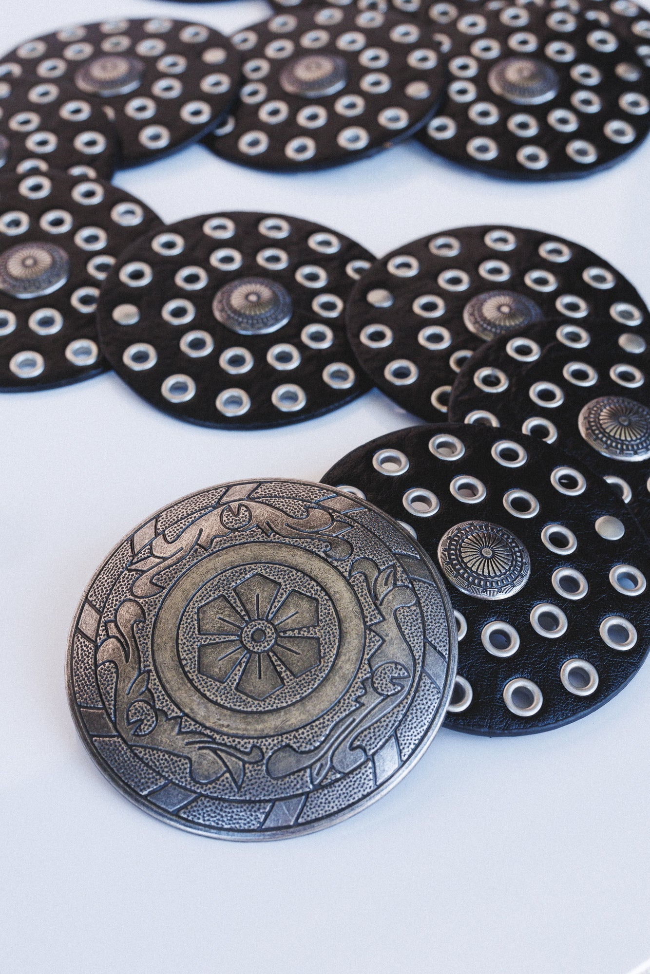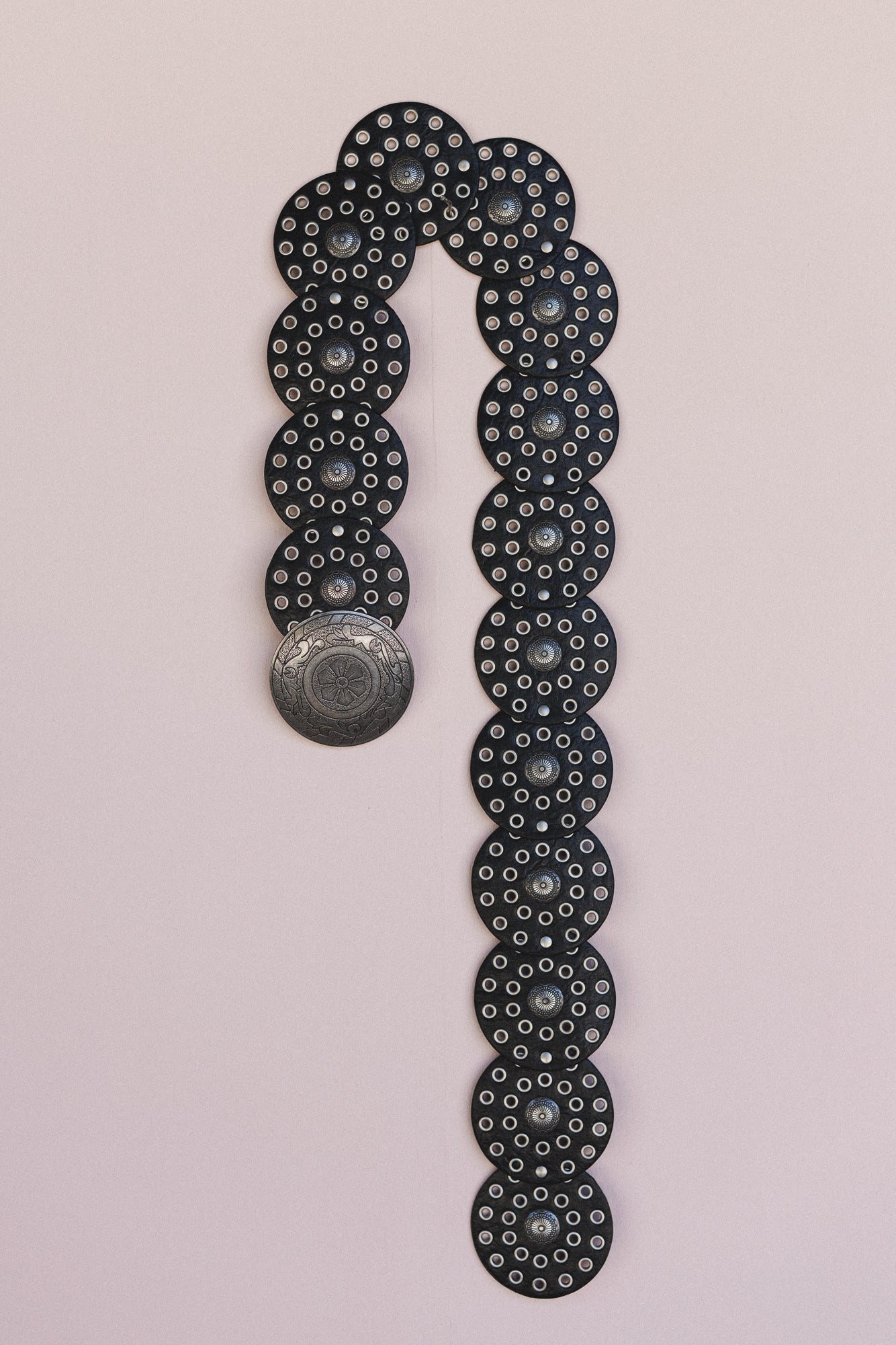 Turn heads with this silver and leather belt that looks perfect with flowy maxi dresses and skirts.