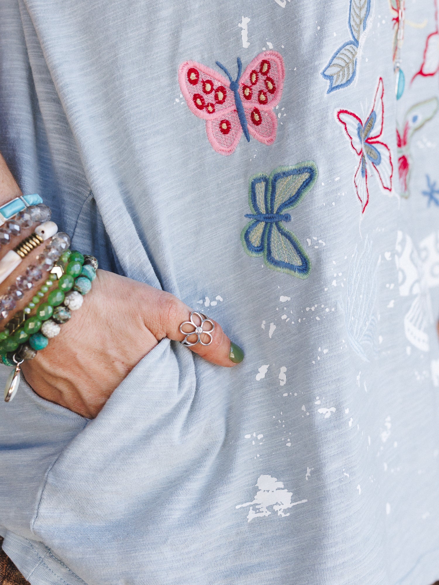 - Colorful embroidered butterflies with “free soul” graphic detail