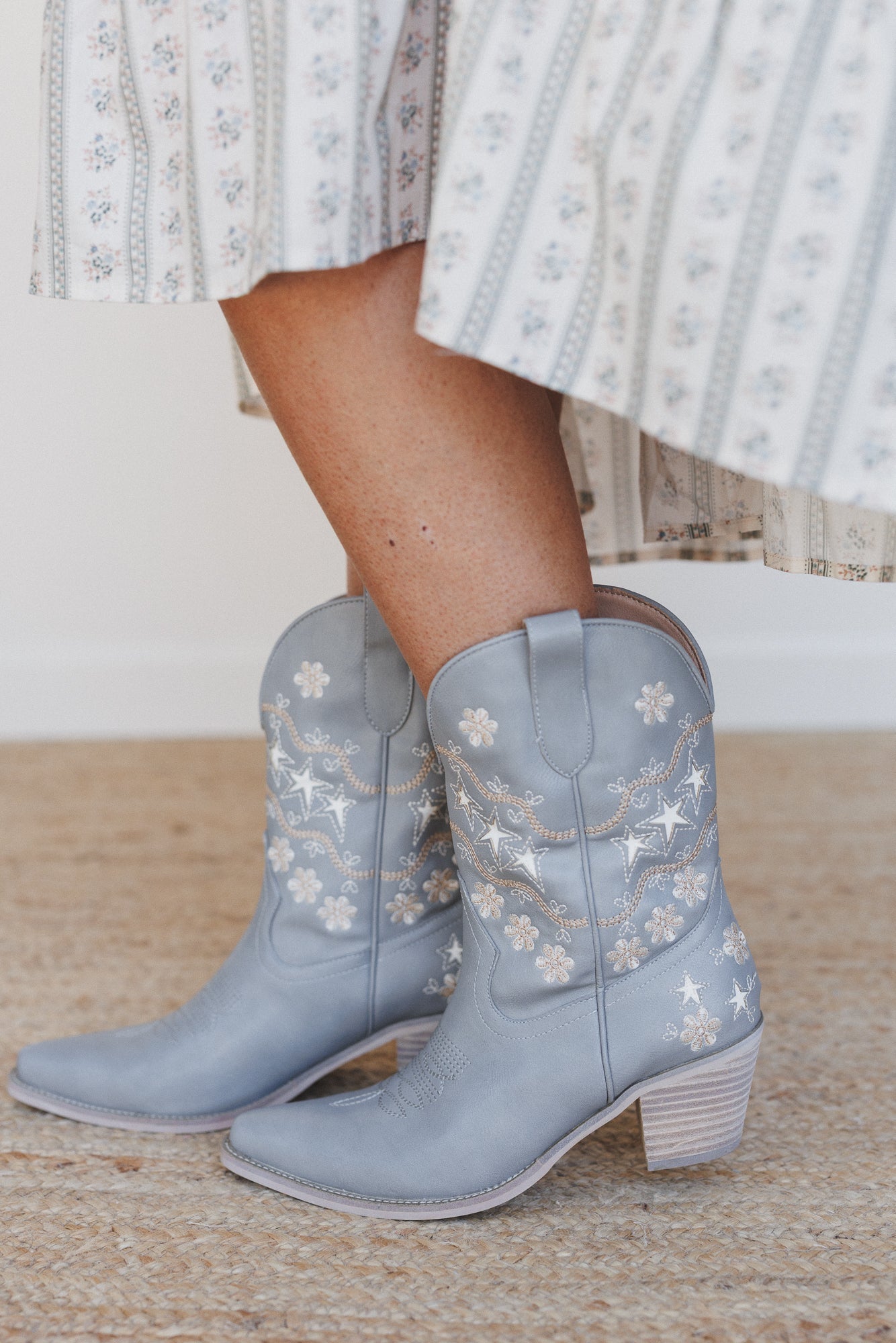 - Step into western-chic magic with these dreamy gray boots. The floral and star embroidery brings a touch of wanderlust charm, making them the perfect statement for both everyday boho style and special nights under the stars.