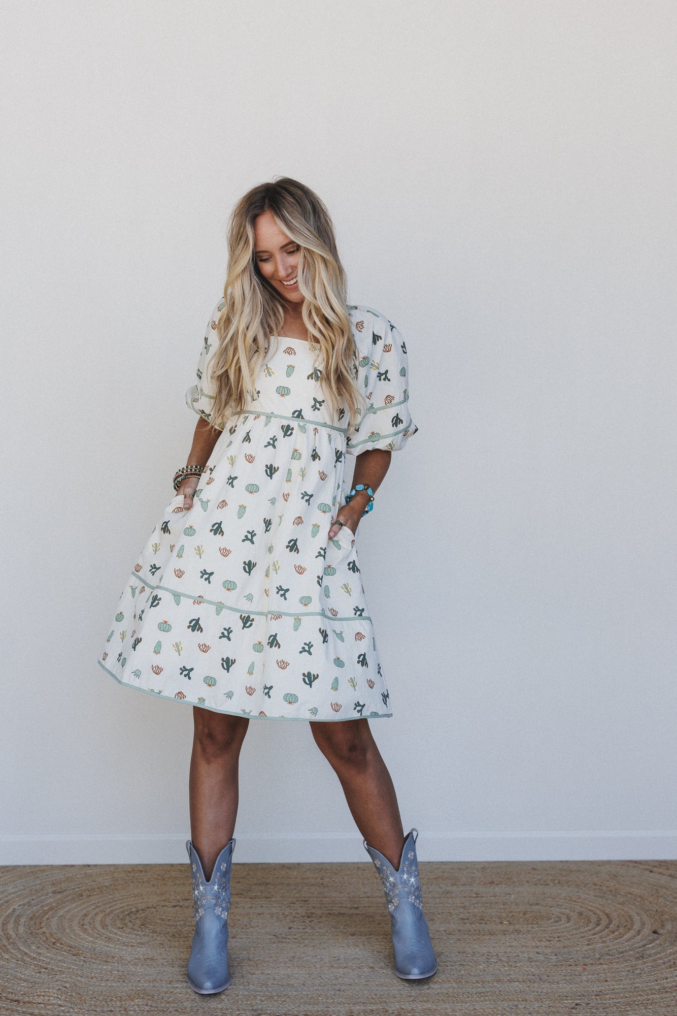 - Bring the spirit of the Southwest into your wardrobe with this cactus-print dress. The airy cream fabric and boho-inspired pattern make it perfect for sunny escapes and everyday wanderlust.