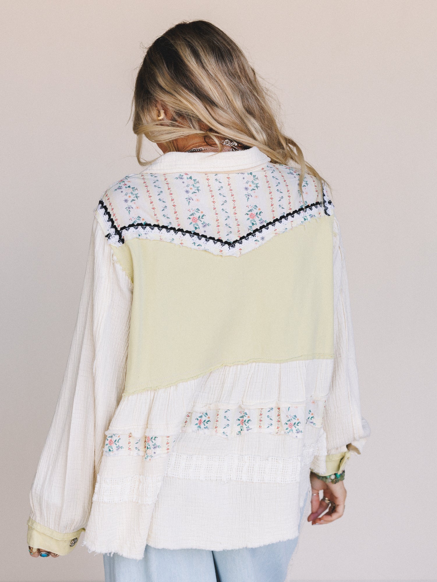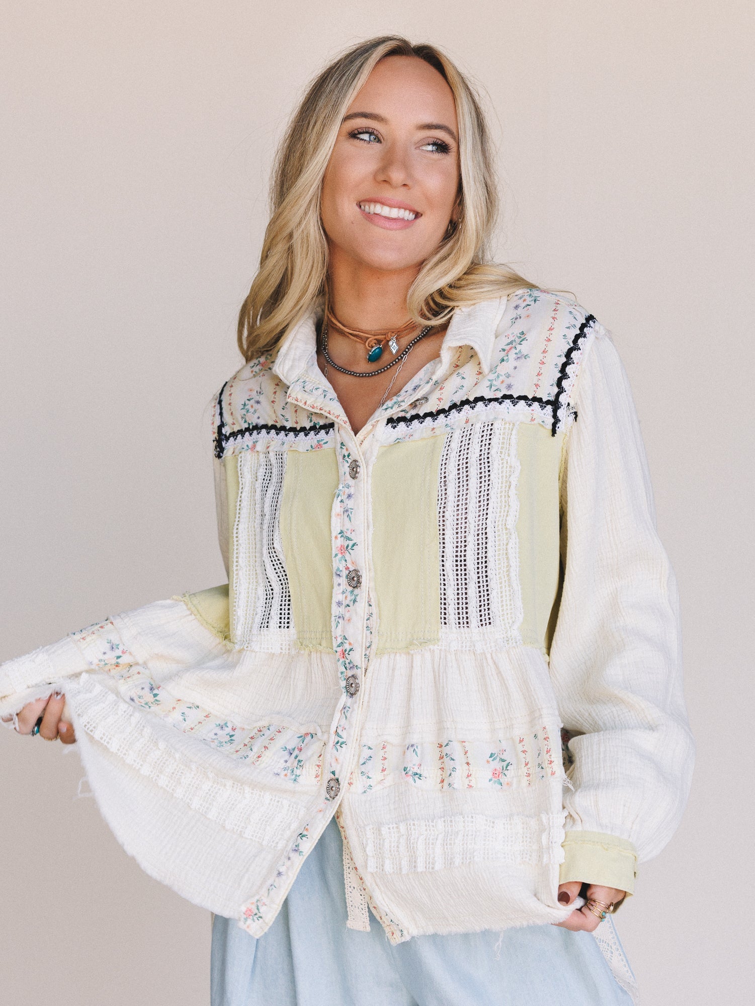 Vintage vibes and prairie charm come alive in the Cool Revival Top — a whimsical blend of soft pastels, florals, and lacey textures that feel like a fresh take on a timeless favorite.