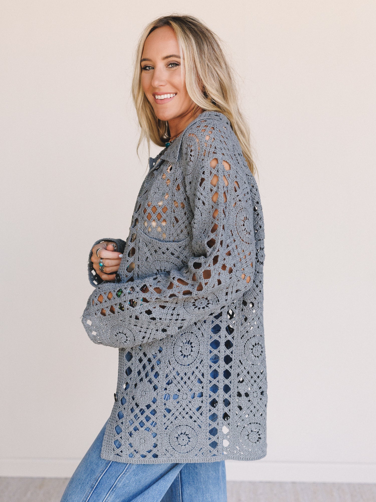 - Slate grey crochet cardigan with button front and intricate openwork detail