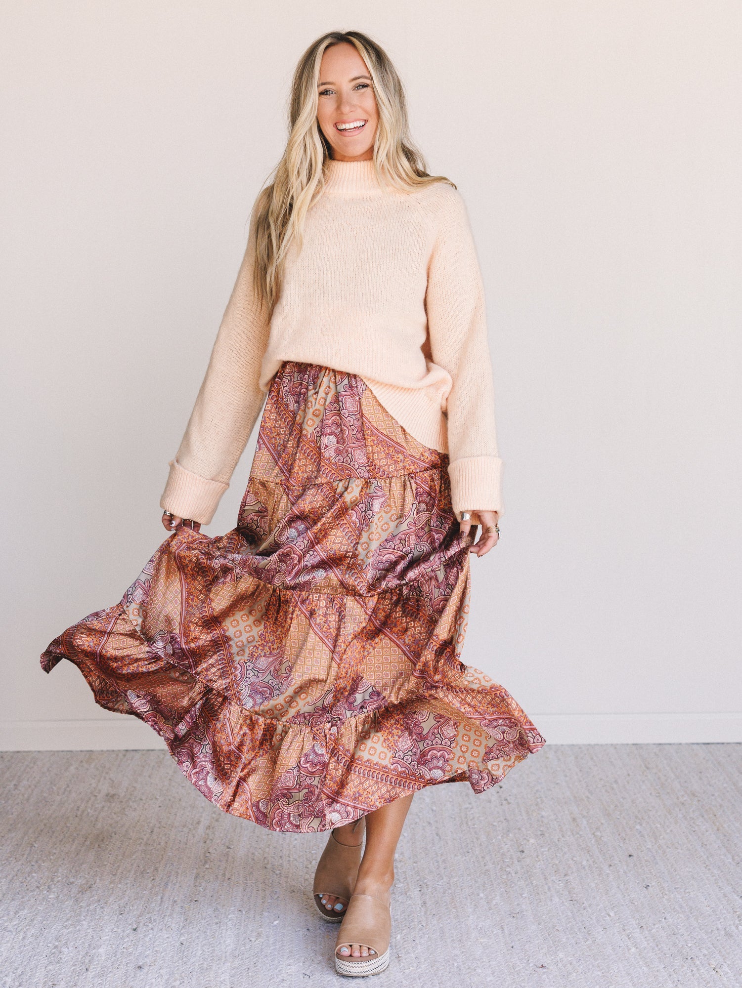 Add a little swirl and a lot of color to your day with the Fern Print Skirt — a twirl-worthy statement piece in a rich mix of boho prints. Easygoing yet eye-catching, it’s made for golden hour strolls and cozy coffee runs alike.