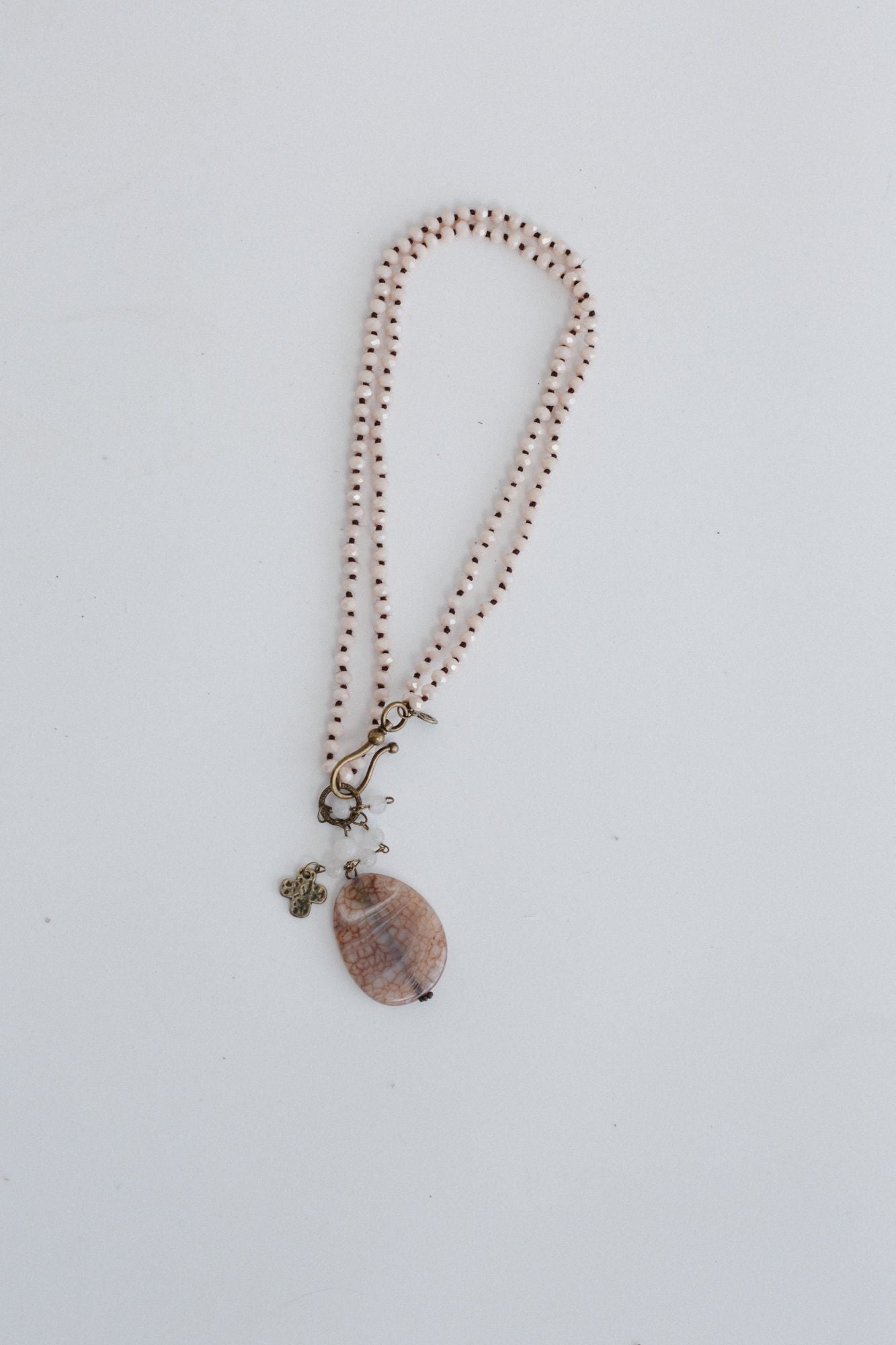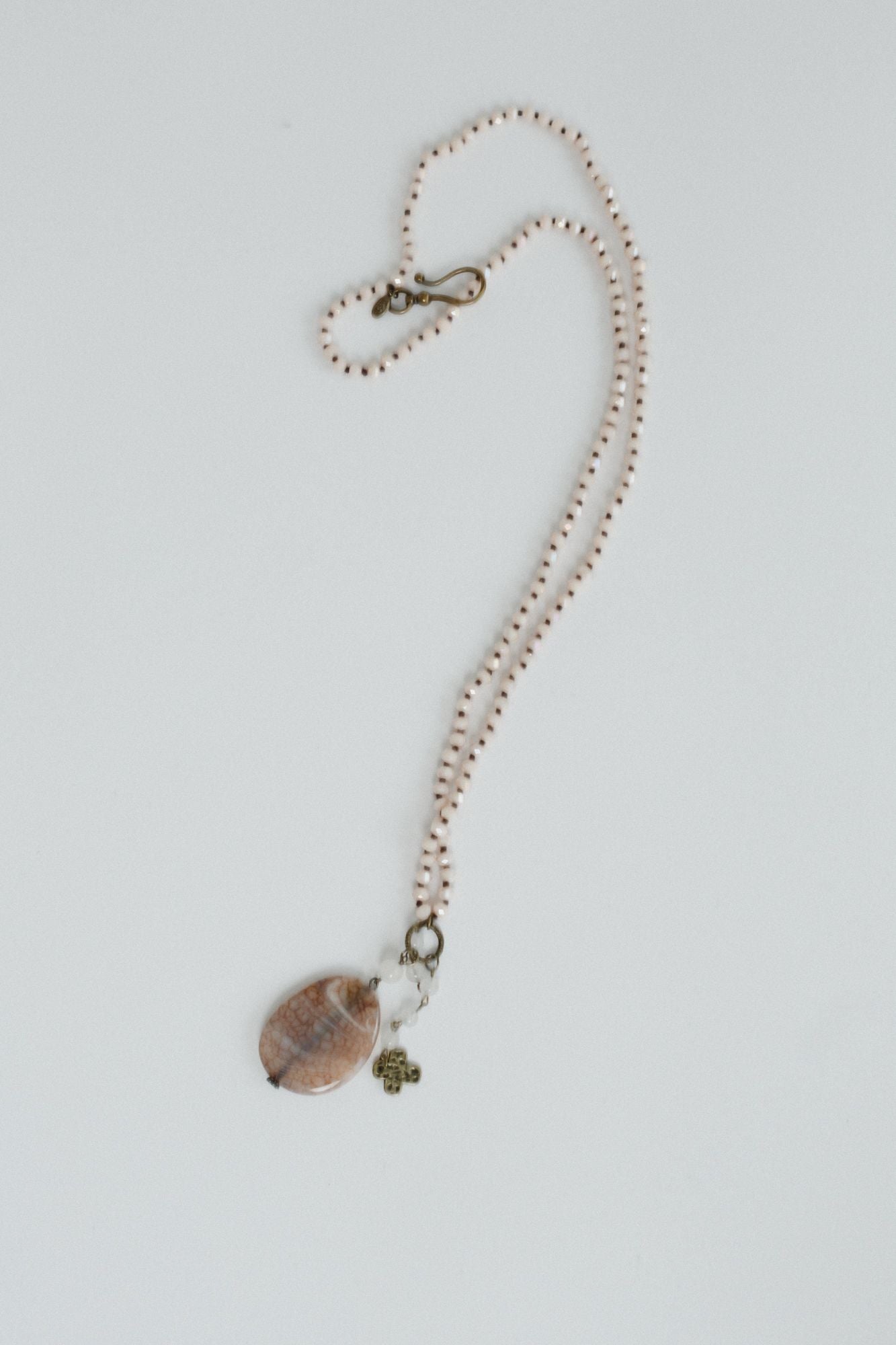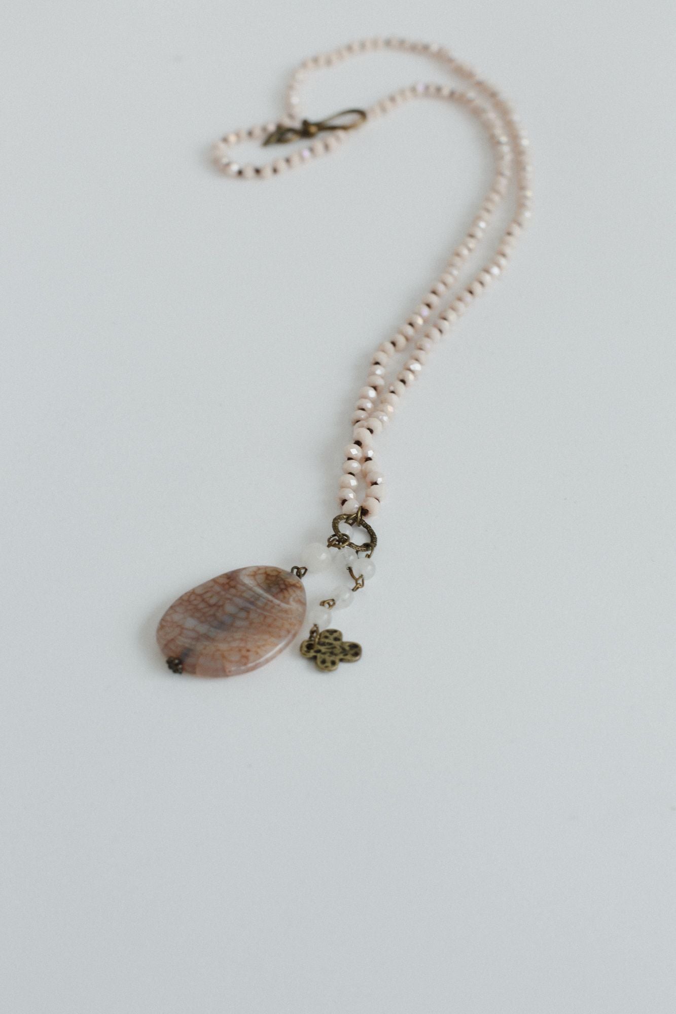 - Unique statement detail including a polished agate stone, a small bronze cross, and a pretty teardrop bead