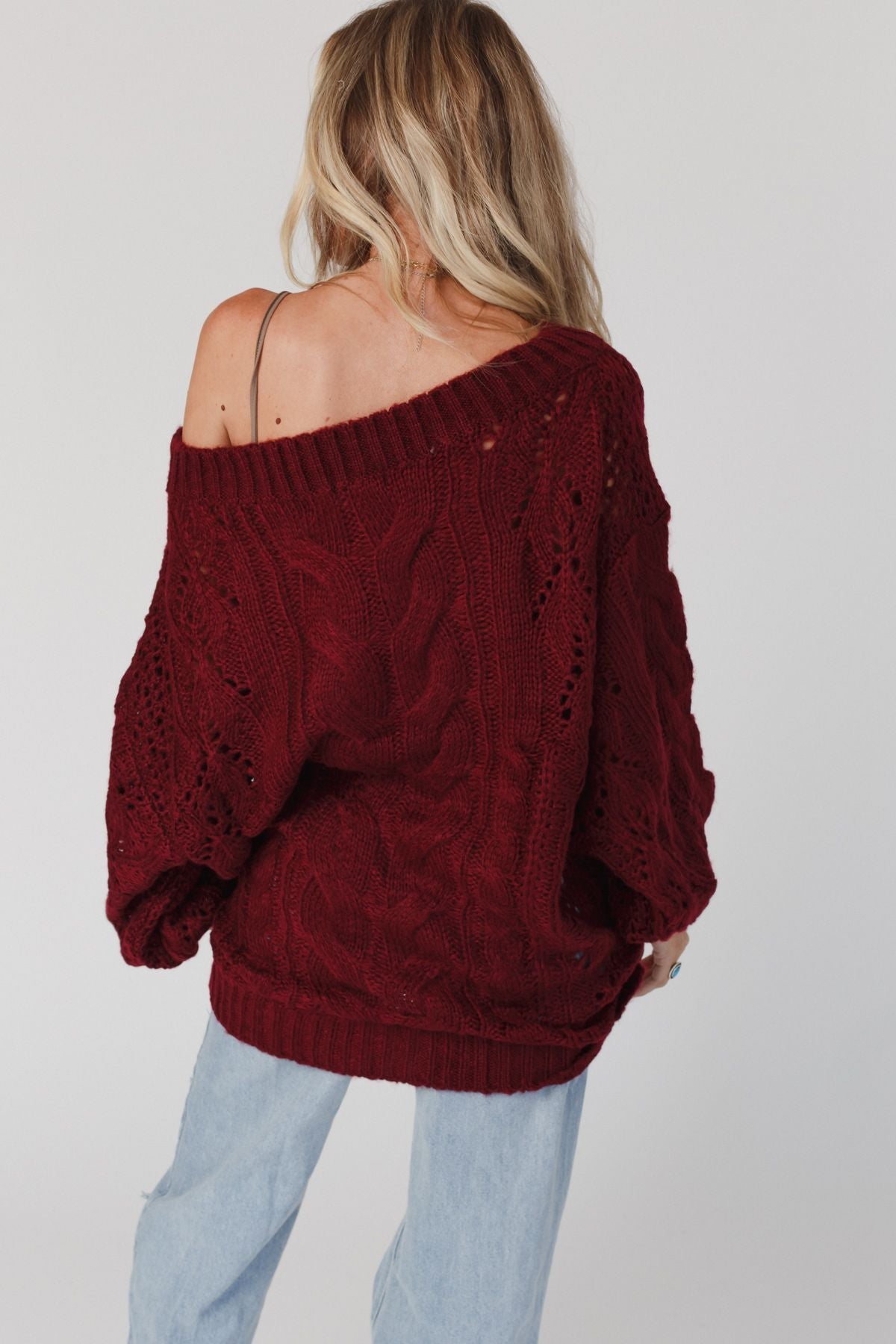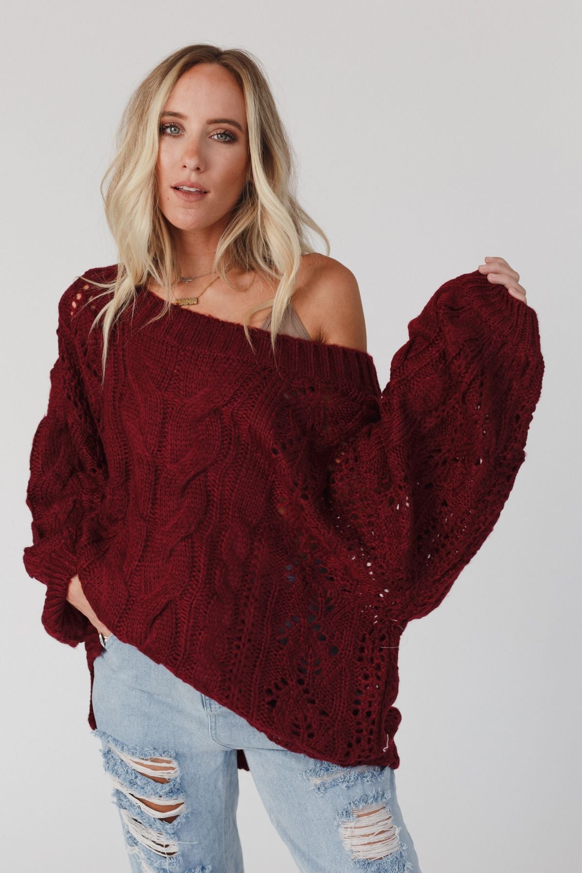 A coveted, chunky sweater is ready for anything with stylish balloon-sleeves and comfy drop-shoulders that can easily be worn off-the-shoulder. This length pairs well with leggings or with a front-tuck into jeans. Snuggly cable-knit warms the spirit when the weather gets frosty.