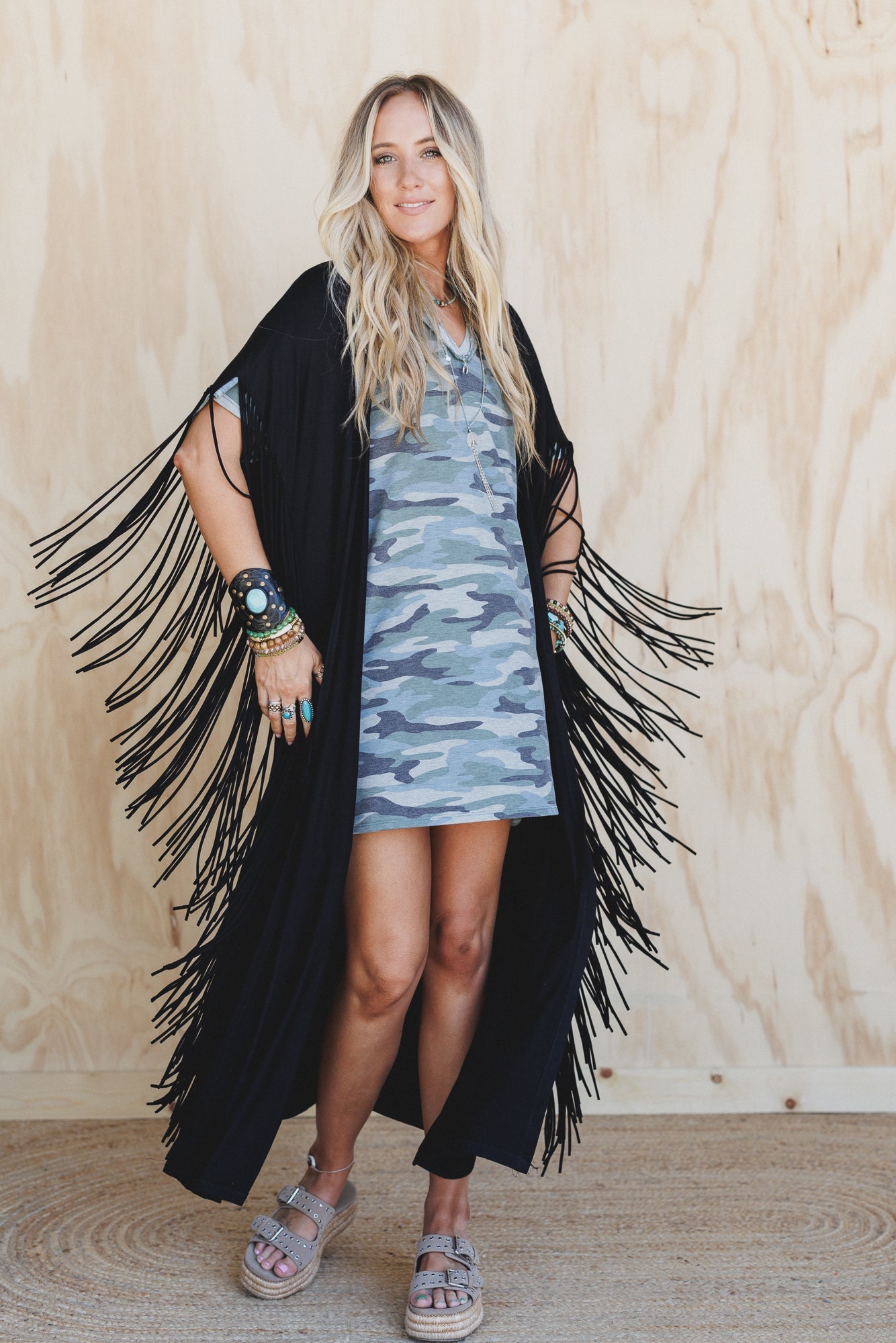 - Excited to bring you the Showstopper Duster Kimono from our exclusive collection; The Nest by Three Bird Nest. Check out the rest of the collection here. Pair this fringe kimono with any tee and jeans look for instant added cool.