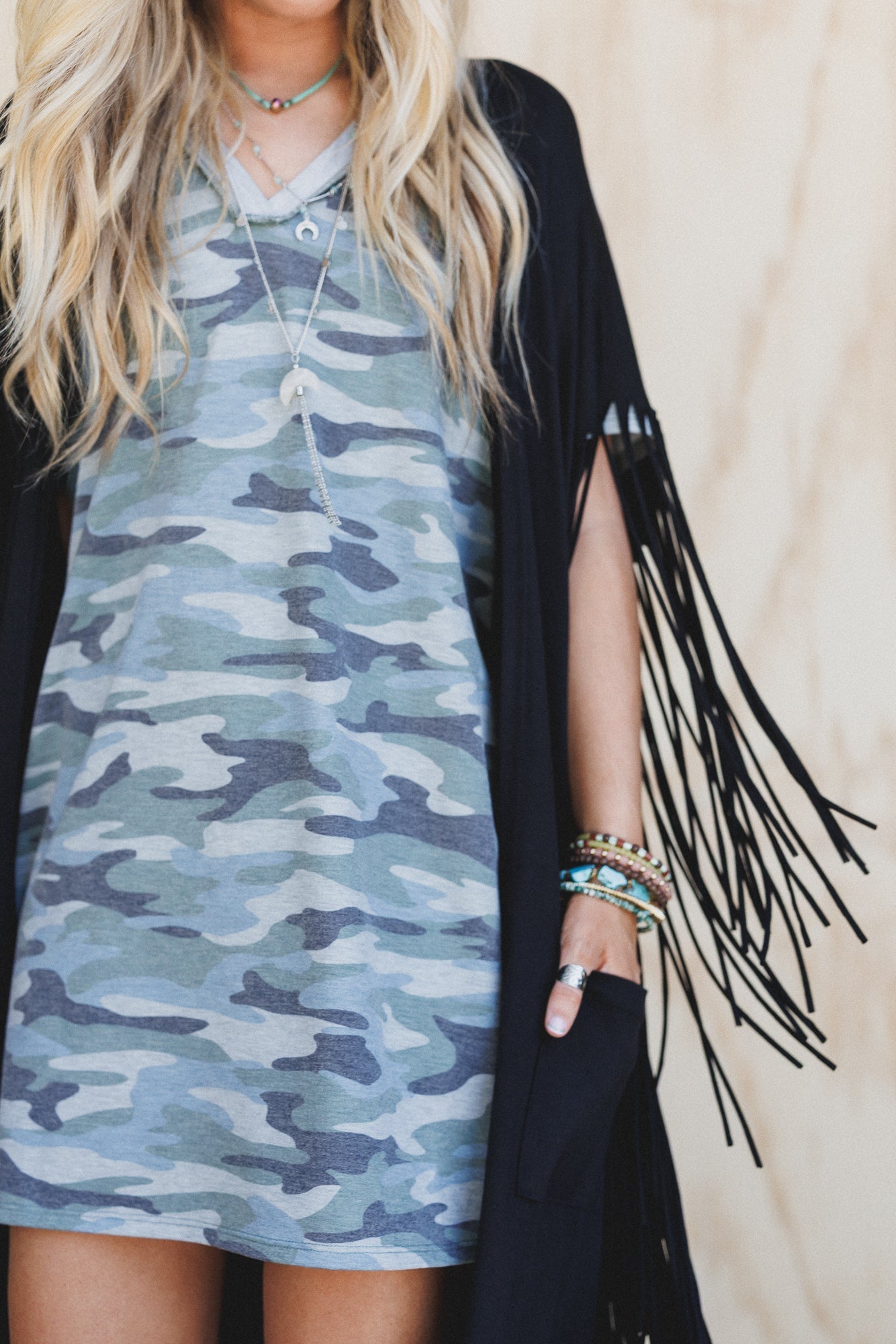 - Easily elevate this camo shirt dress with a statement necklace and a stack of bracelets.
