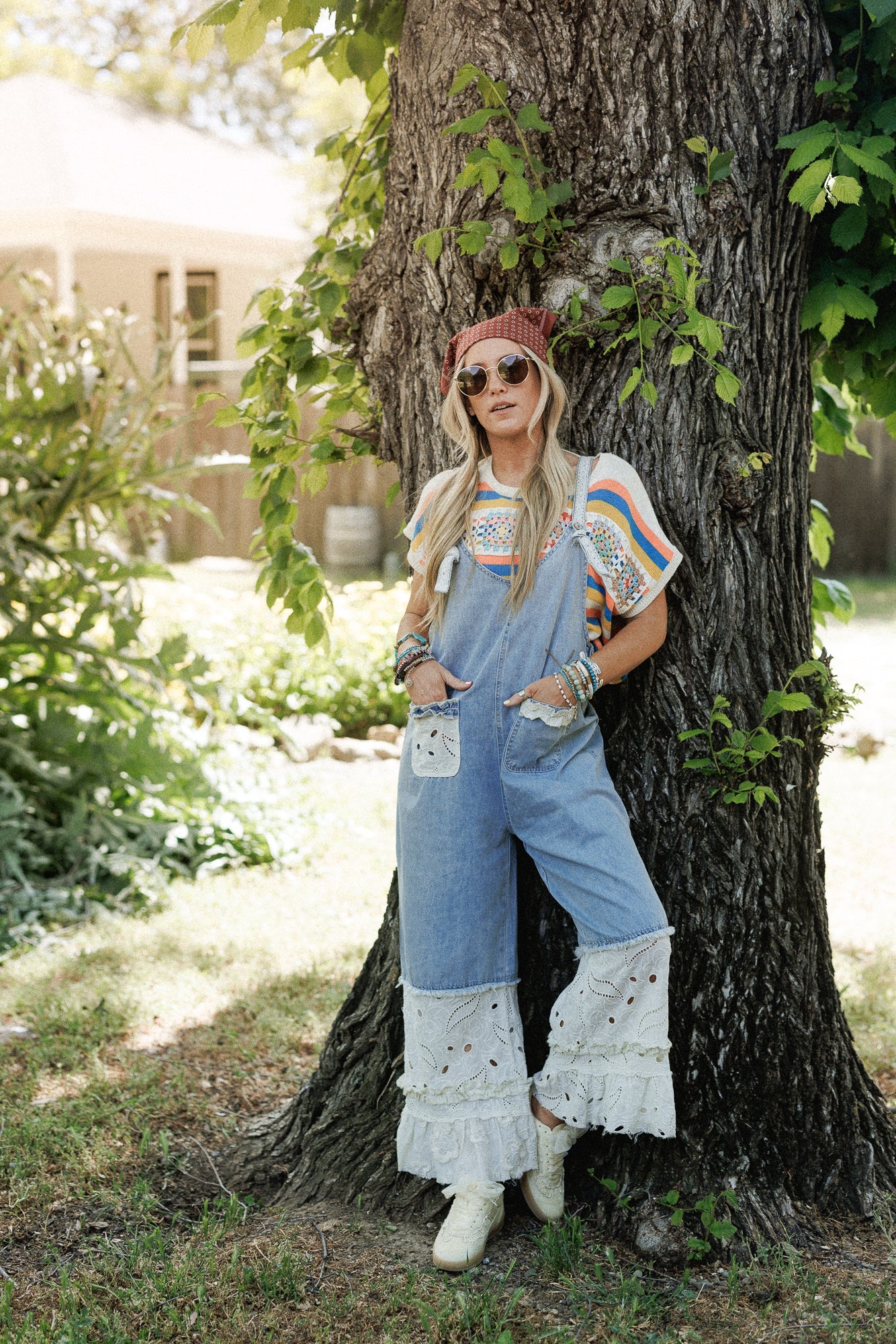 - These mixed fabric overalls are truly unique and pair perfectly with sheer tops for a look with plenty of texture.