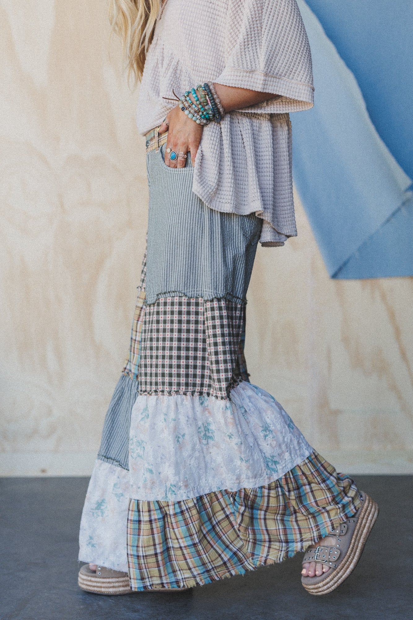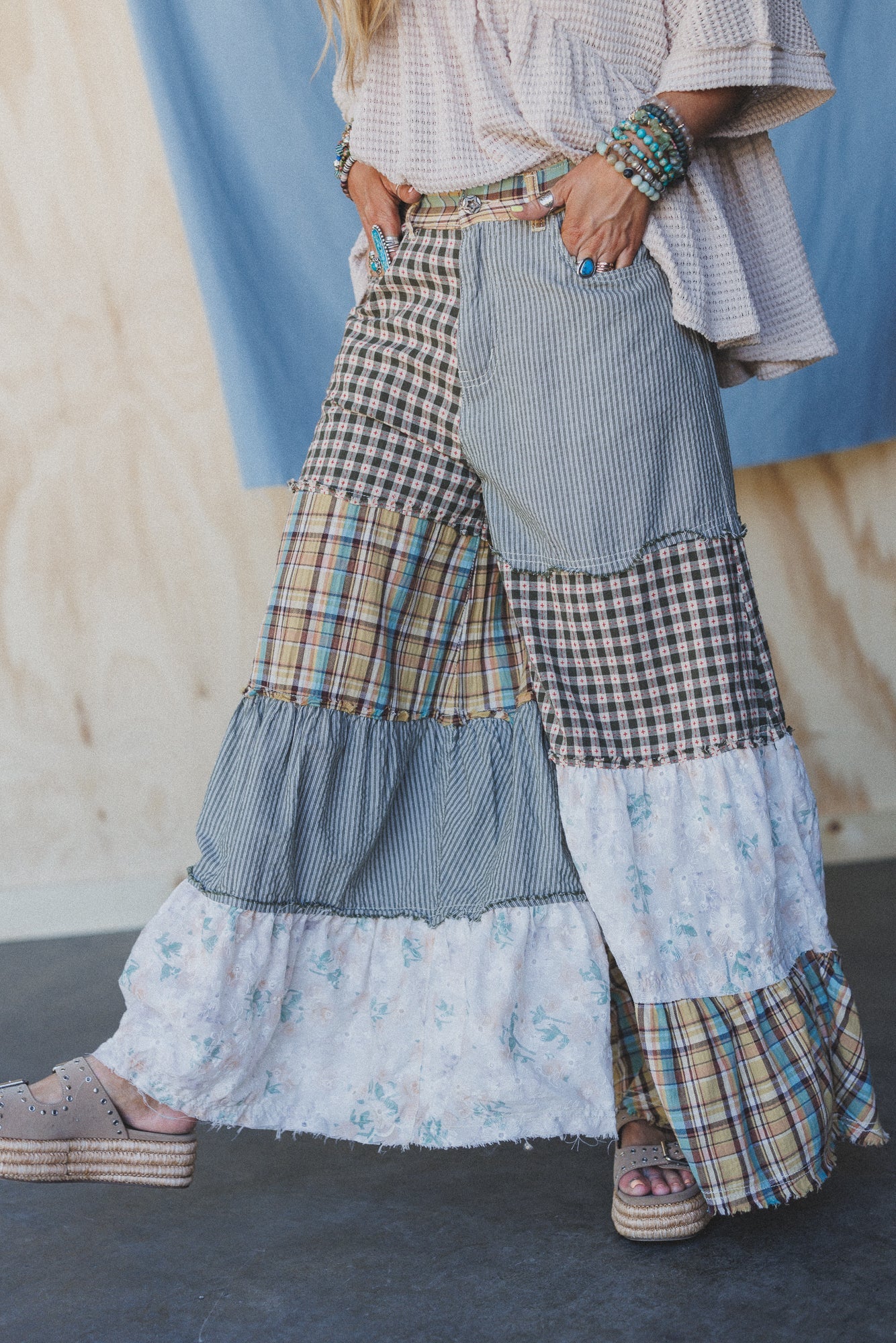 These patchwork pants are wide and billowy to make a bold statement this season.