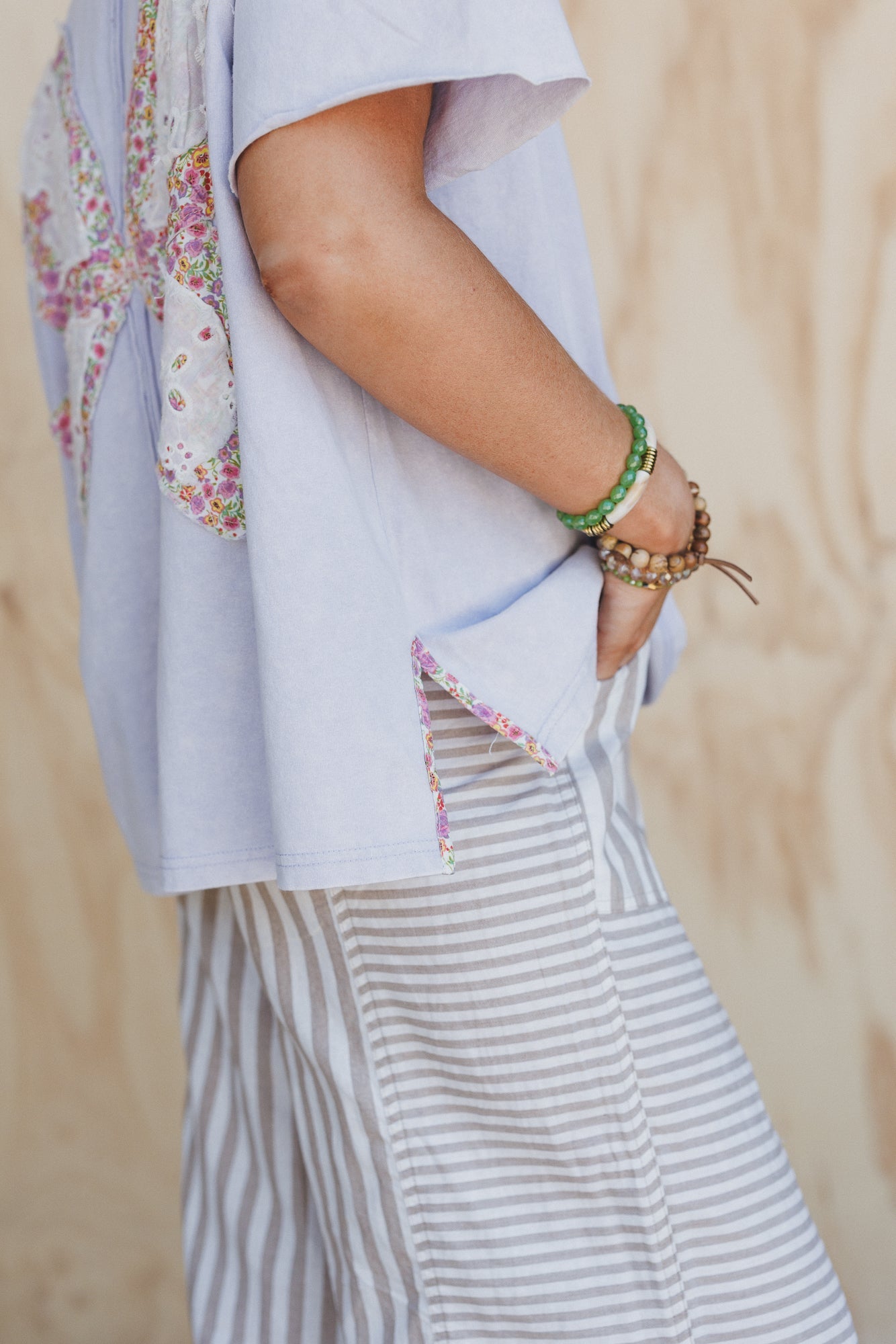 This adorable patchwork tee pairs perfectly with joggers and sneakers for a cool casual look.