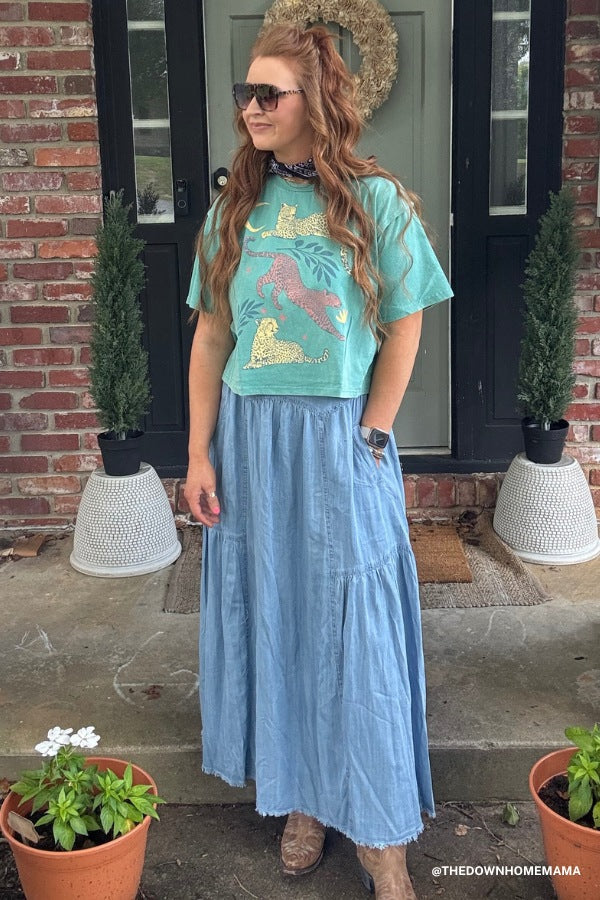 Awaken your wild side with this super cute tiger graphic tee that looks amazing with maxi skirts and boots.