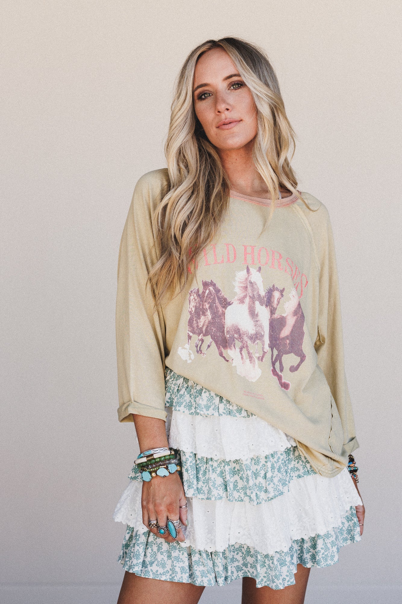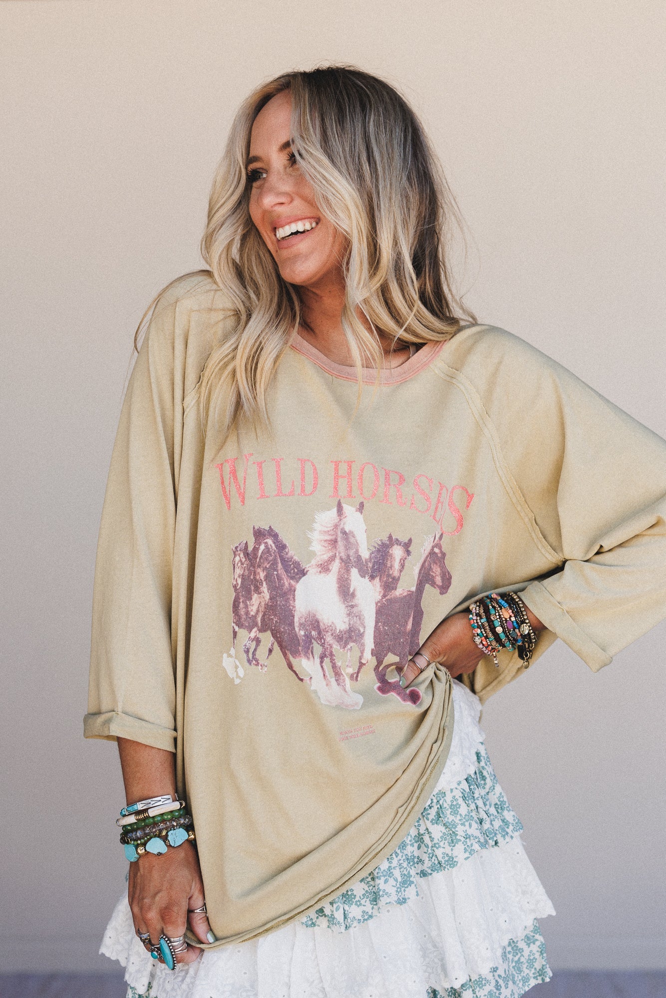 - Let your free spirit run wild in the Wild Mustang Graphic Top. It’s a soft sage staple with serious western vibes.