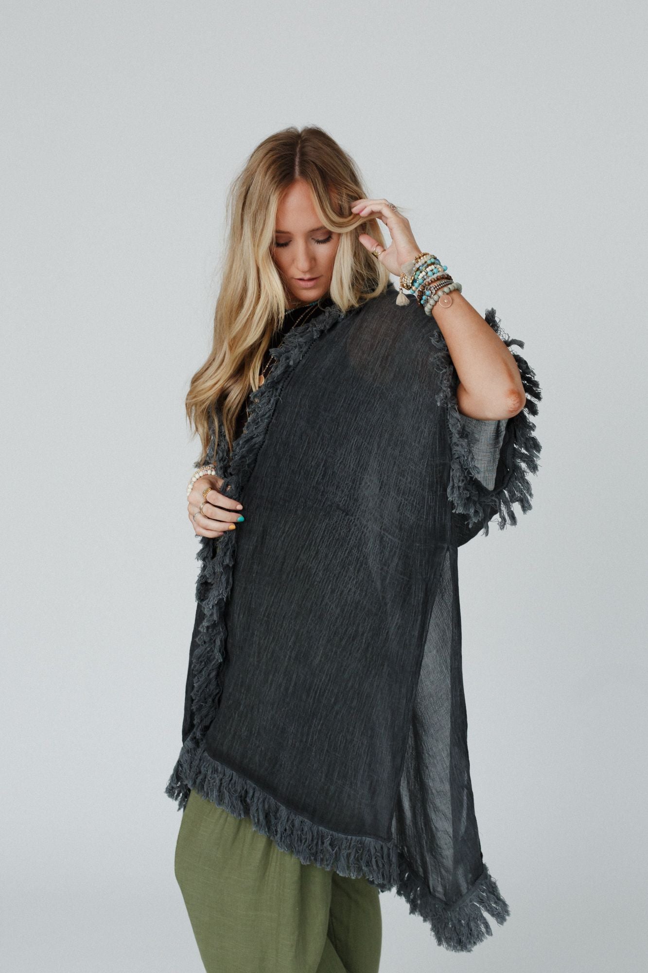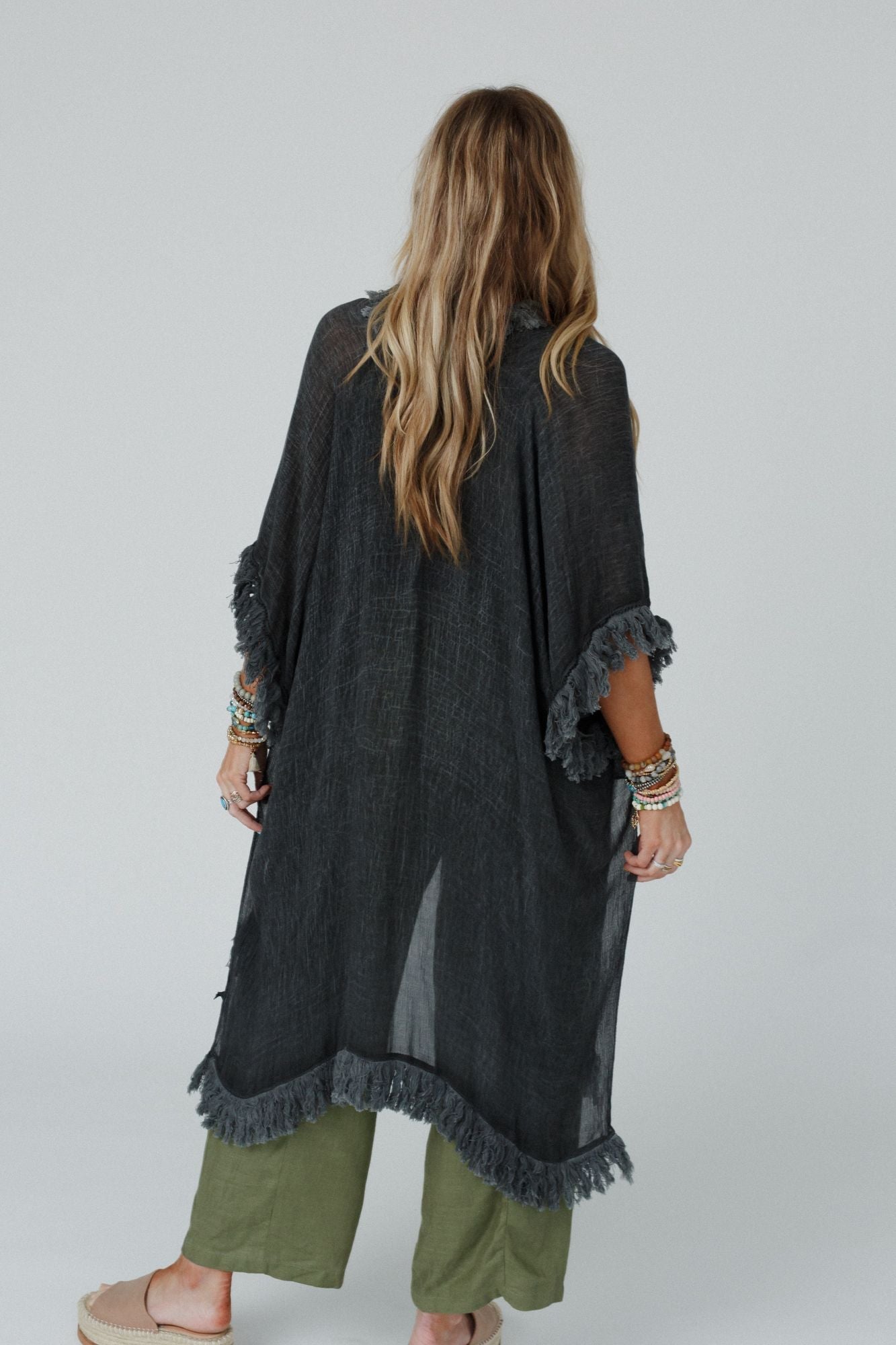 On The Edge Fringe Kimono - Charcoal