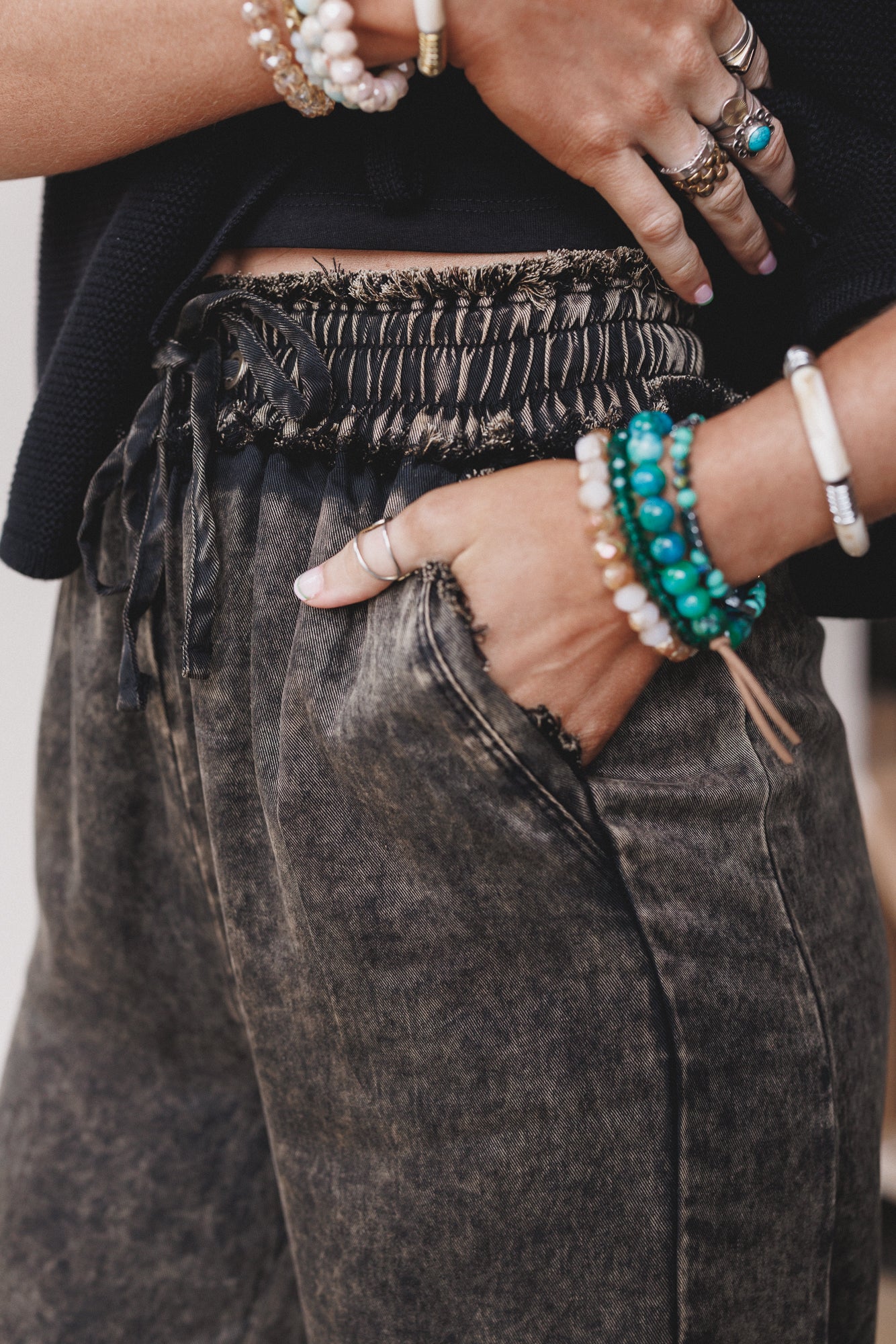 - Wide leg, washed drawstring pants with a smocked waistband for that effortless, flowy silhouette