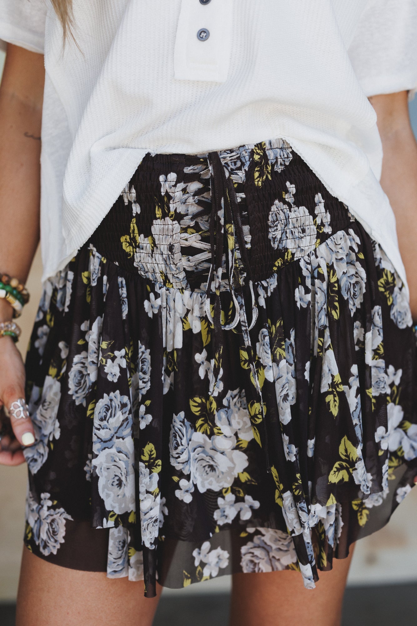 This flirty floral mini skirt pairs perfectly with sheer lace tops for an ultra femme look.