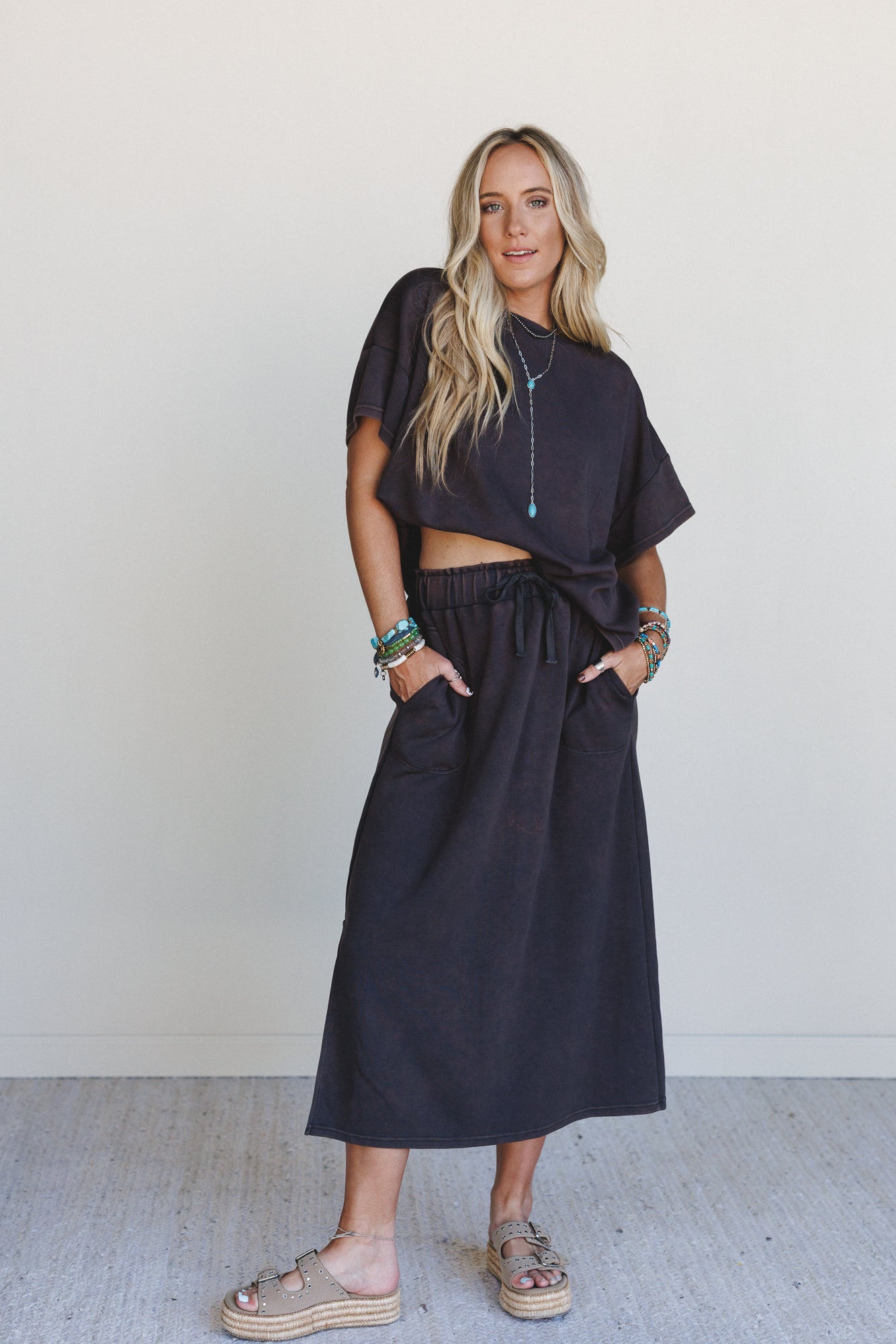 - Midi-length lounge skirt with drawstring waist, big patch pockets, and side slits