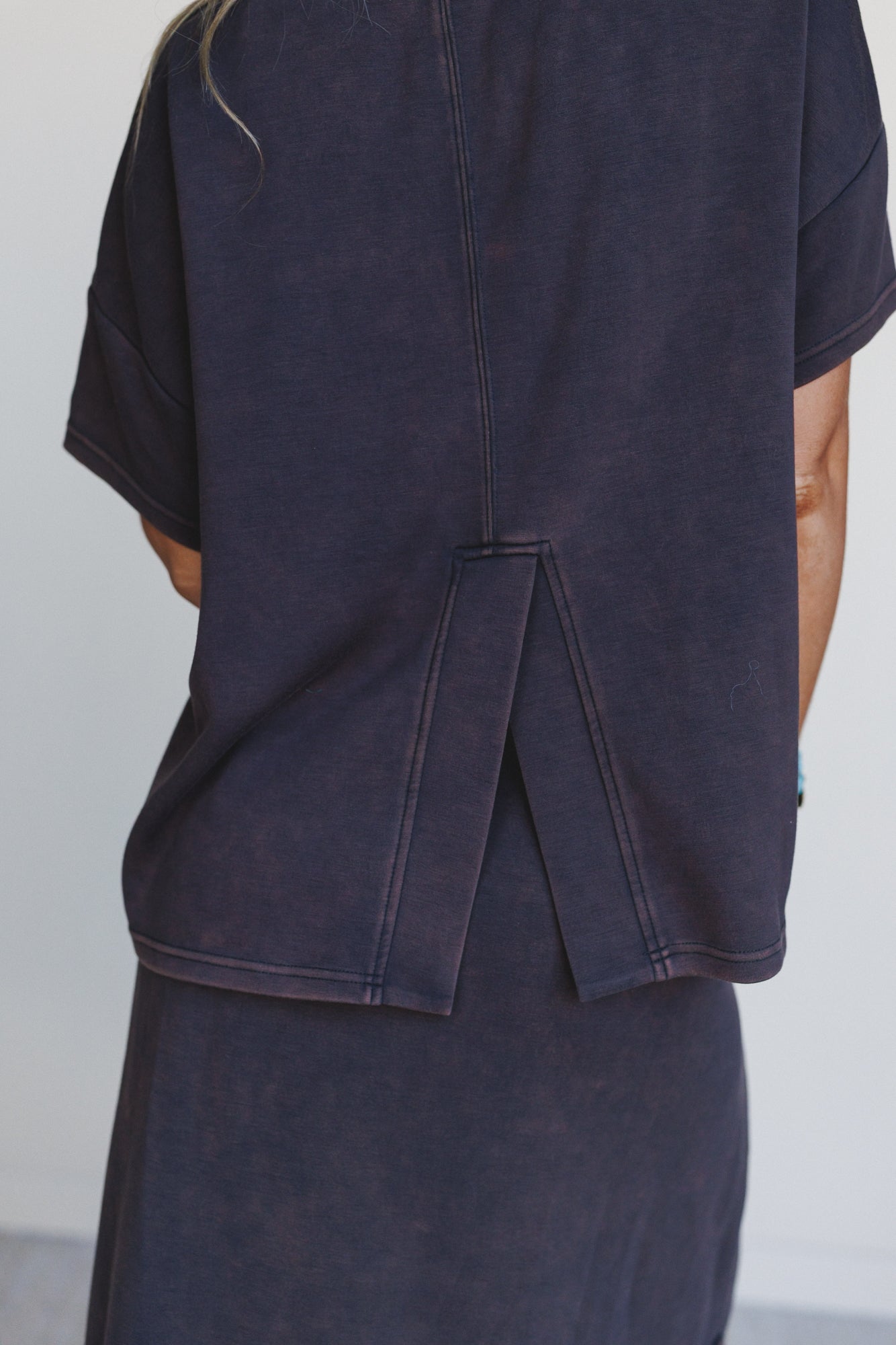 - Oversized tee with drop sleeves and unexpected back pleat detail
