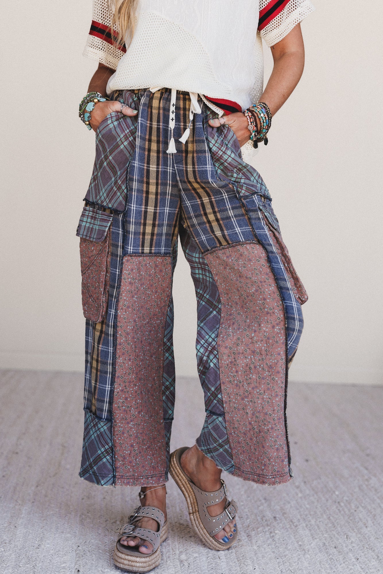 - Relaxed wide leg pants in a patchwork of plaid and ditsy florals for that handcrafted look