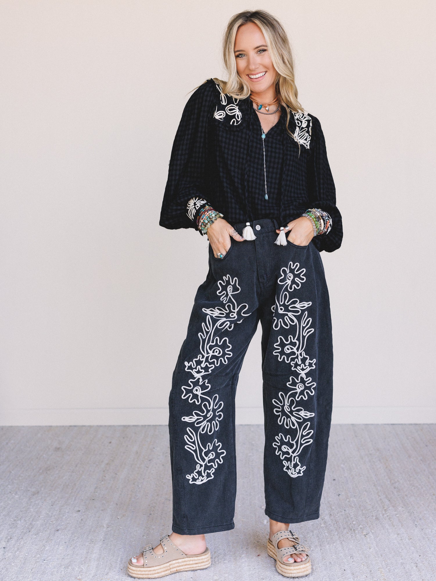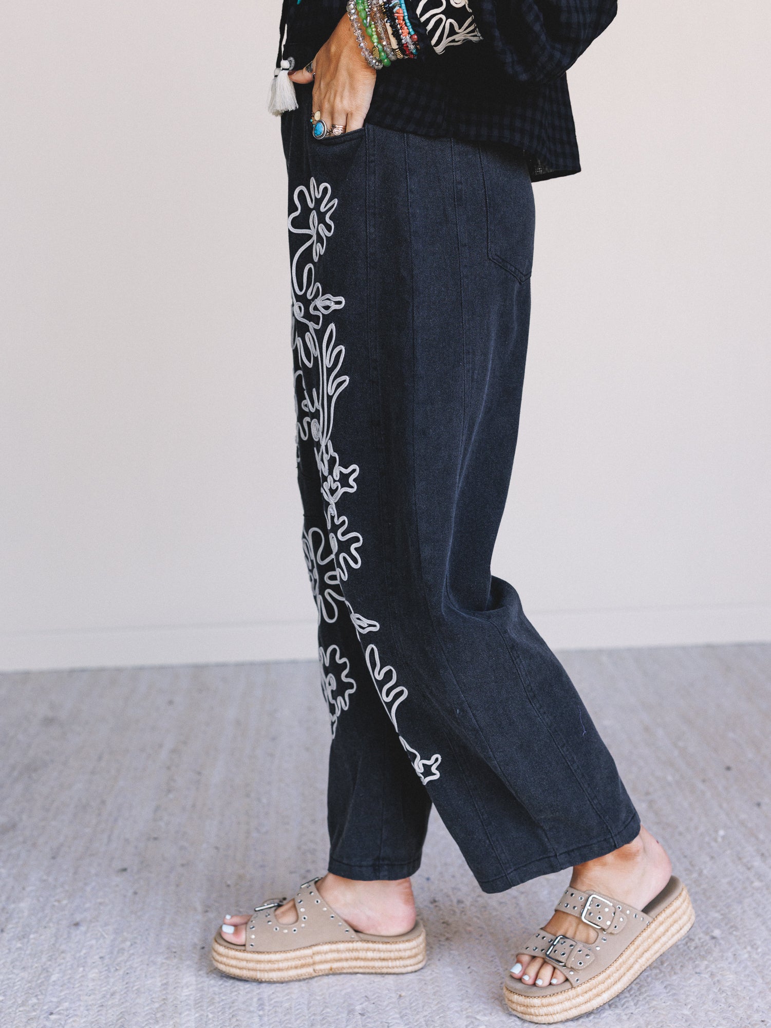 Bring playful energy to your everyday wardrobe with the Steady Vibe Abstract Flower Pants. Crafted in a vintage-washed black denim, this relaxed silhouette is elevated by bold floral embroidery that turns heads and sparks joy.
