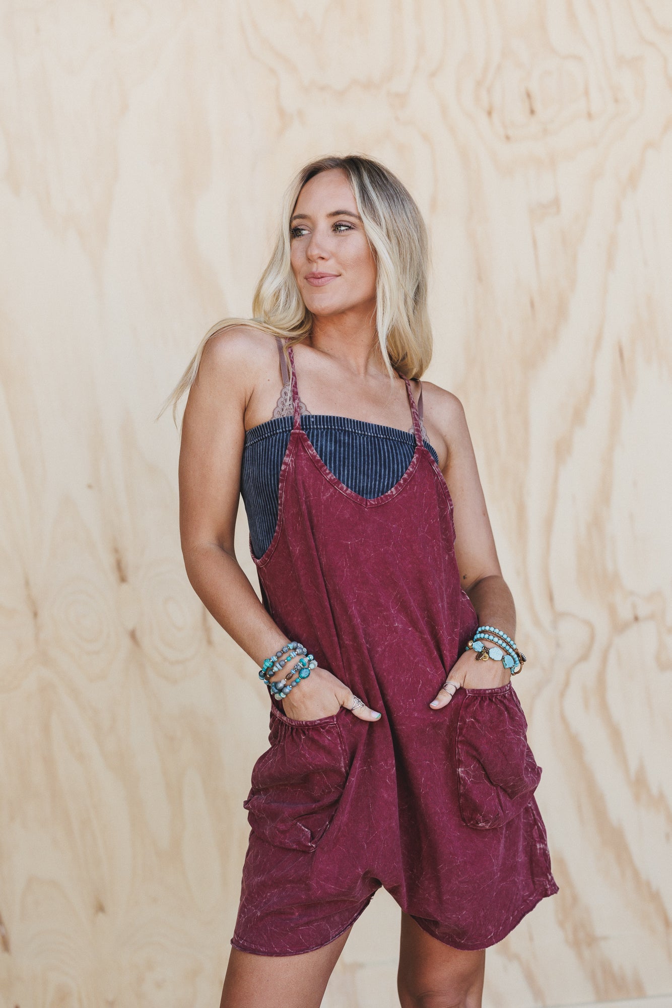 - Laid-back yet totally statement-making, this washed red romper is your shortcut to summer ease. Toss it on with a bandeau or tee and hit the road with your favorite playlist.