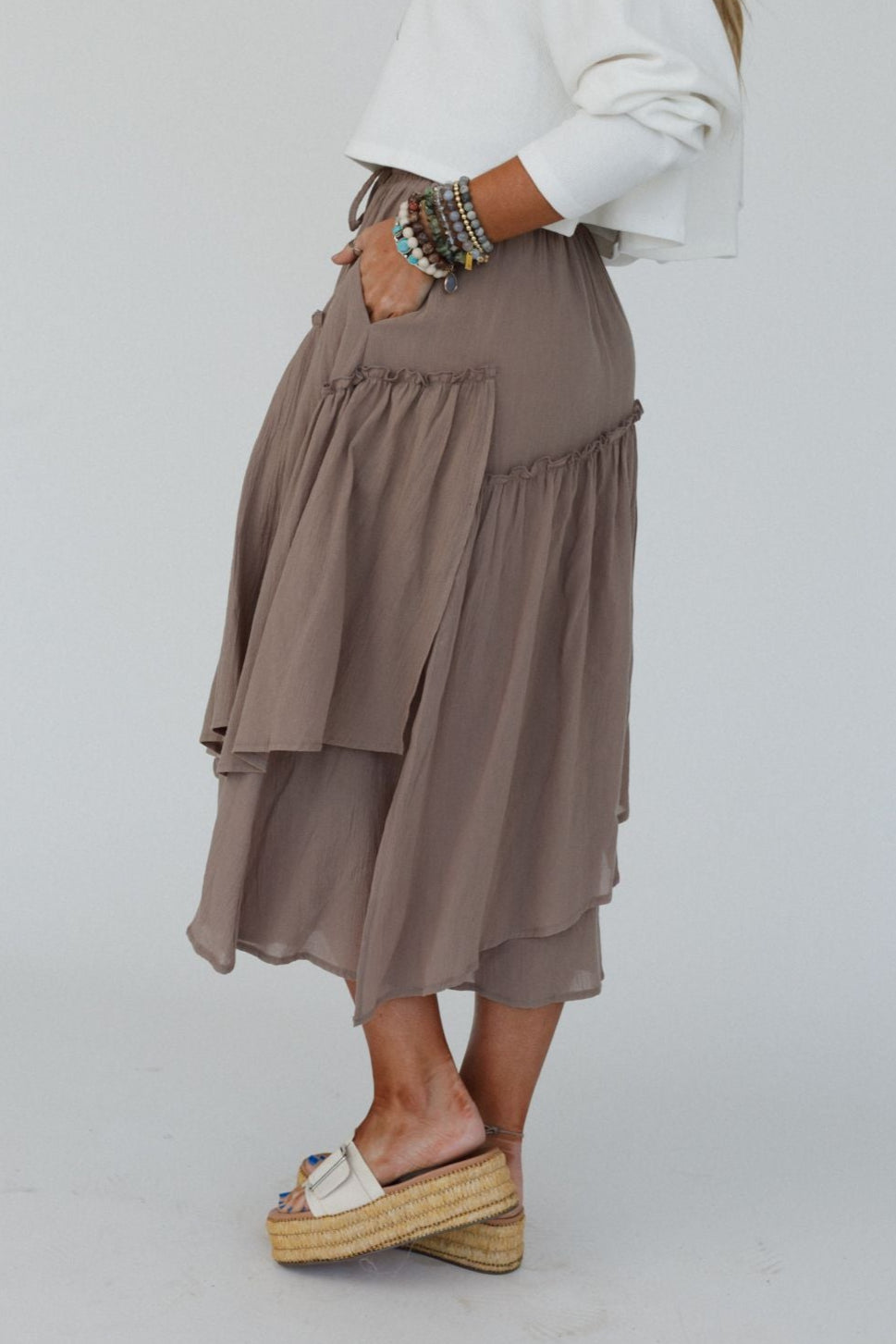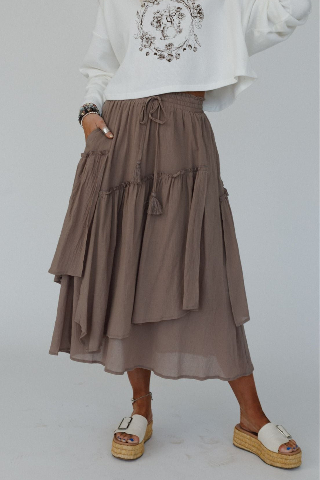 This unique taupe maxi skirt pairs perfectly with graphic tees and denim jackets for a casual cool look.