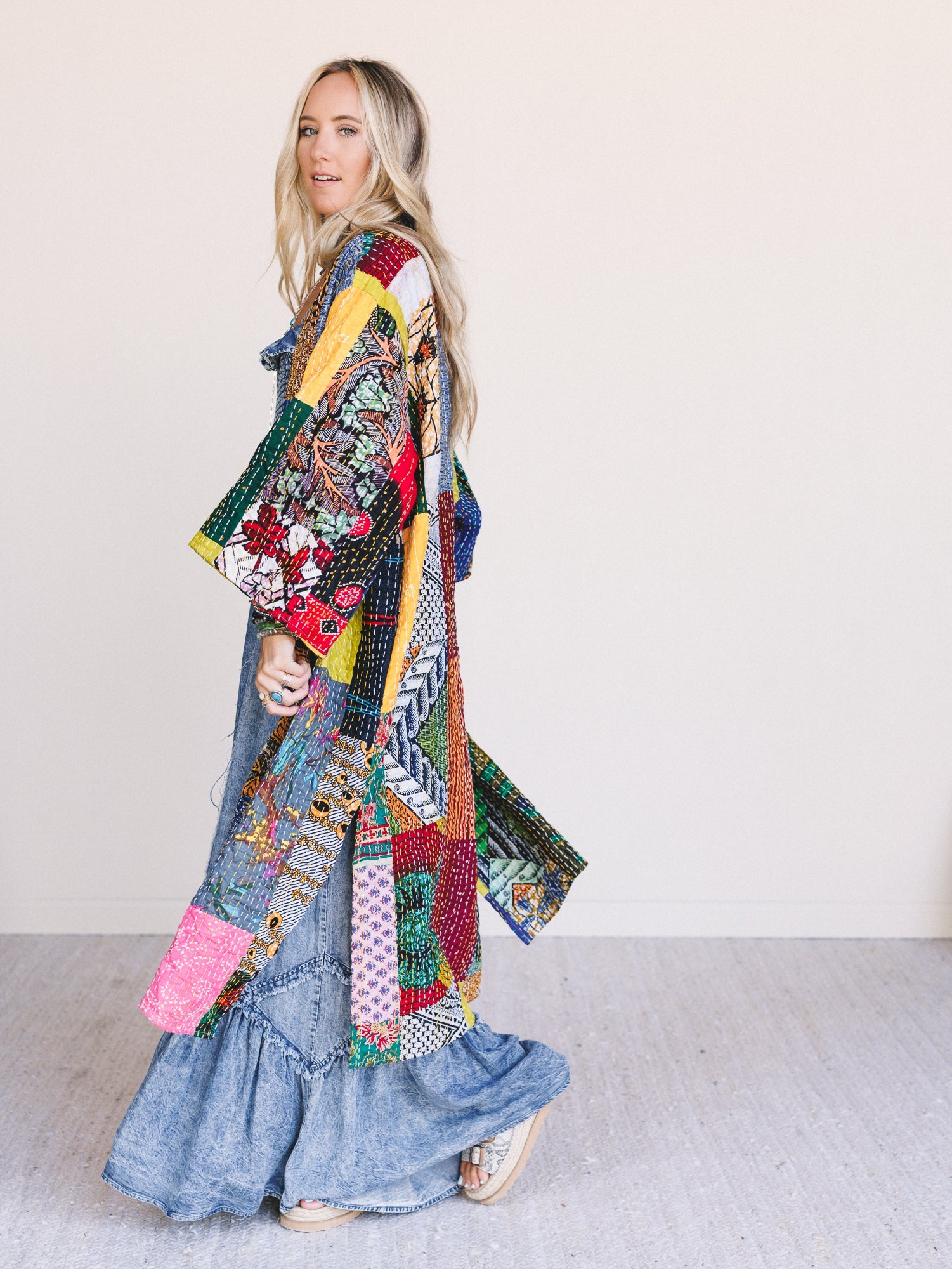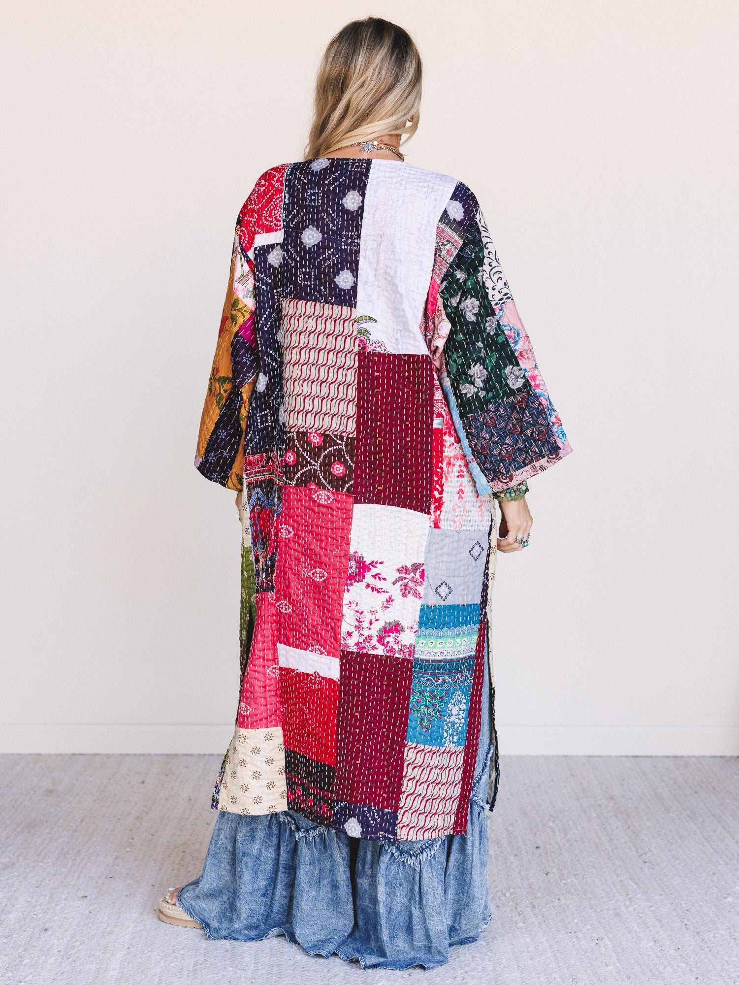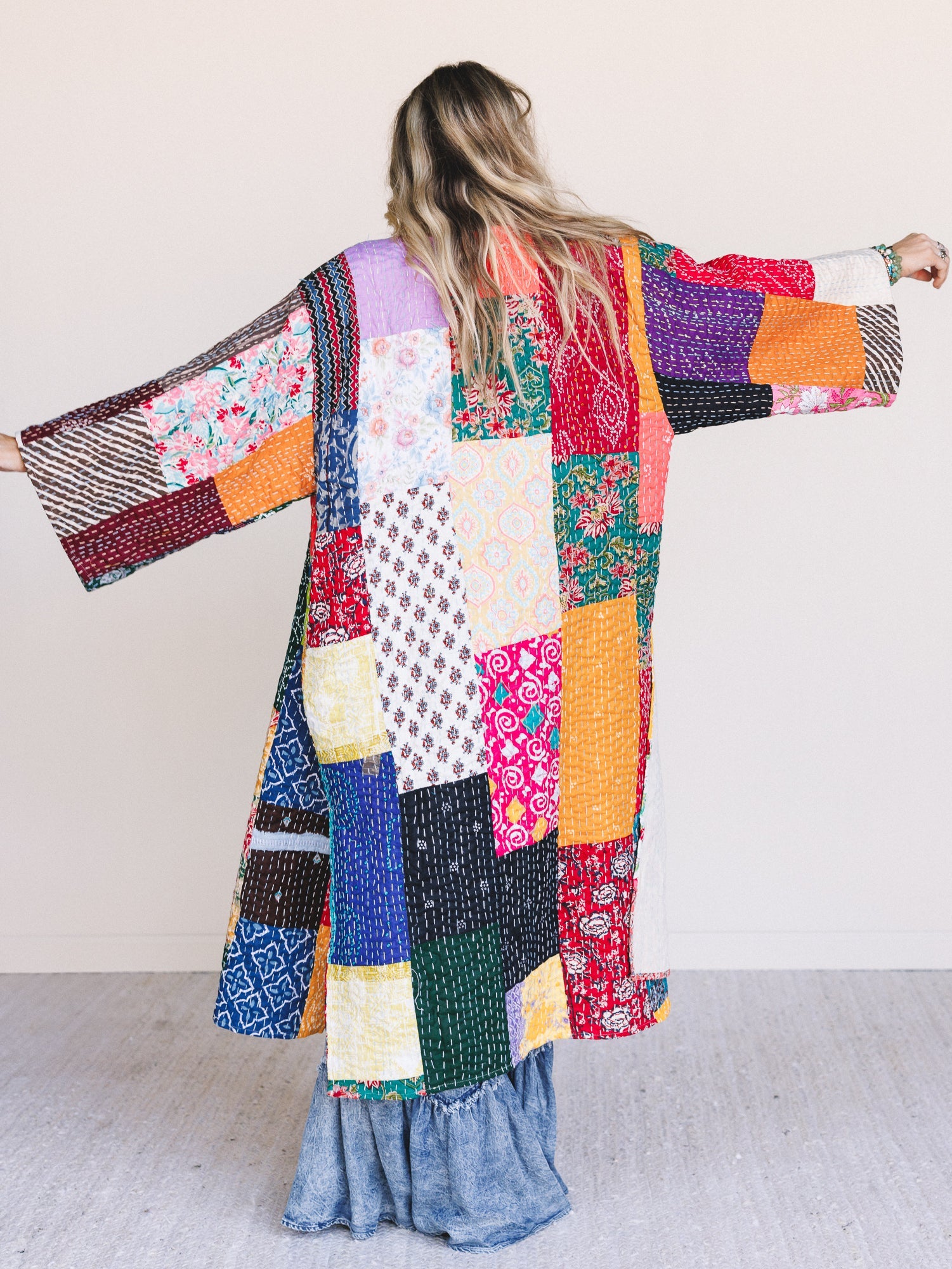 • Wrap yourself in a wearable work of art. The One-of-a-Kind Stargazer Quilted Kimono is crafted from hand-selected vintage quilts, each one thoughtfully reimagined into a colorful, cozy layer. No two are ever the same—meaning the one you receive is entirely unique to you. From vibrant florals to bold patchwork and delicate embroidery, each kimono tells its own story.