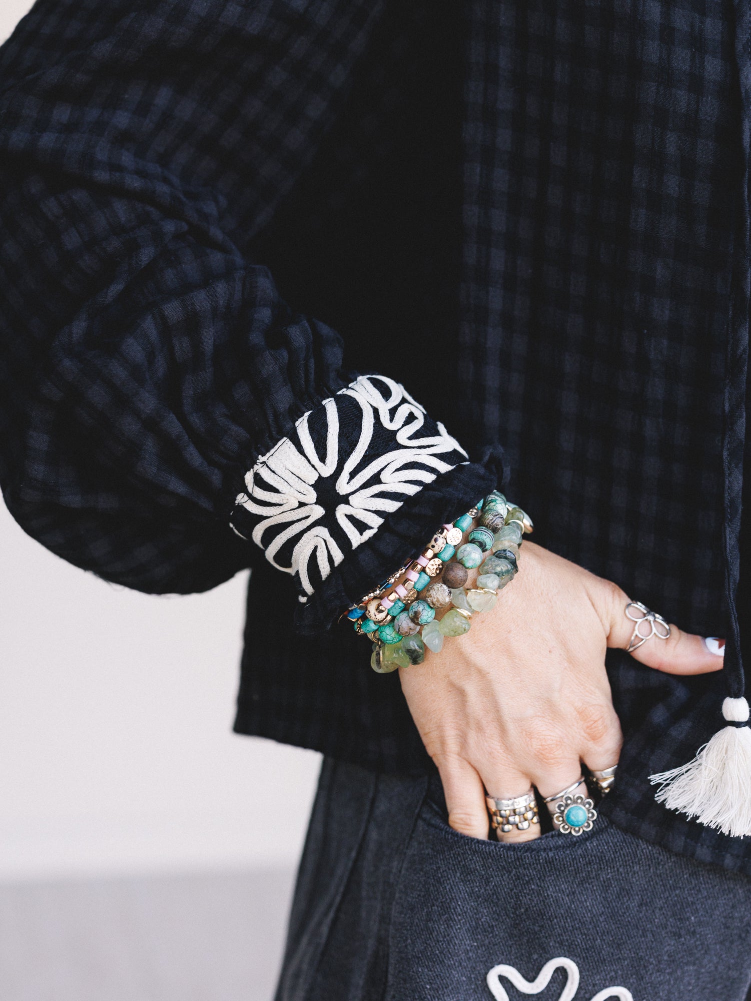 - Contrast embroidery on shoulders and cuffs for an artisanal touch