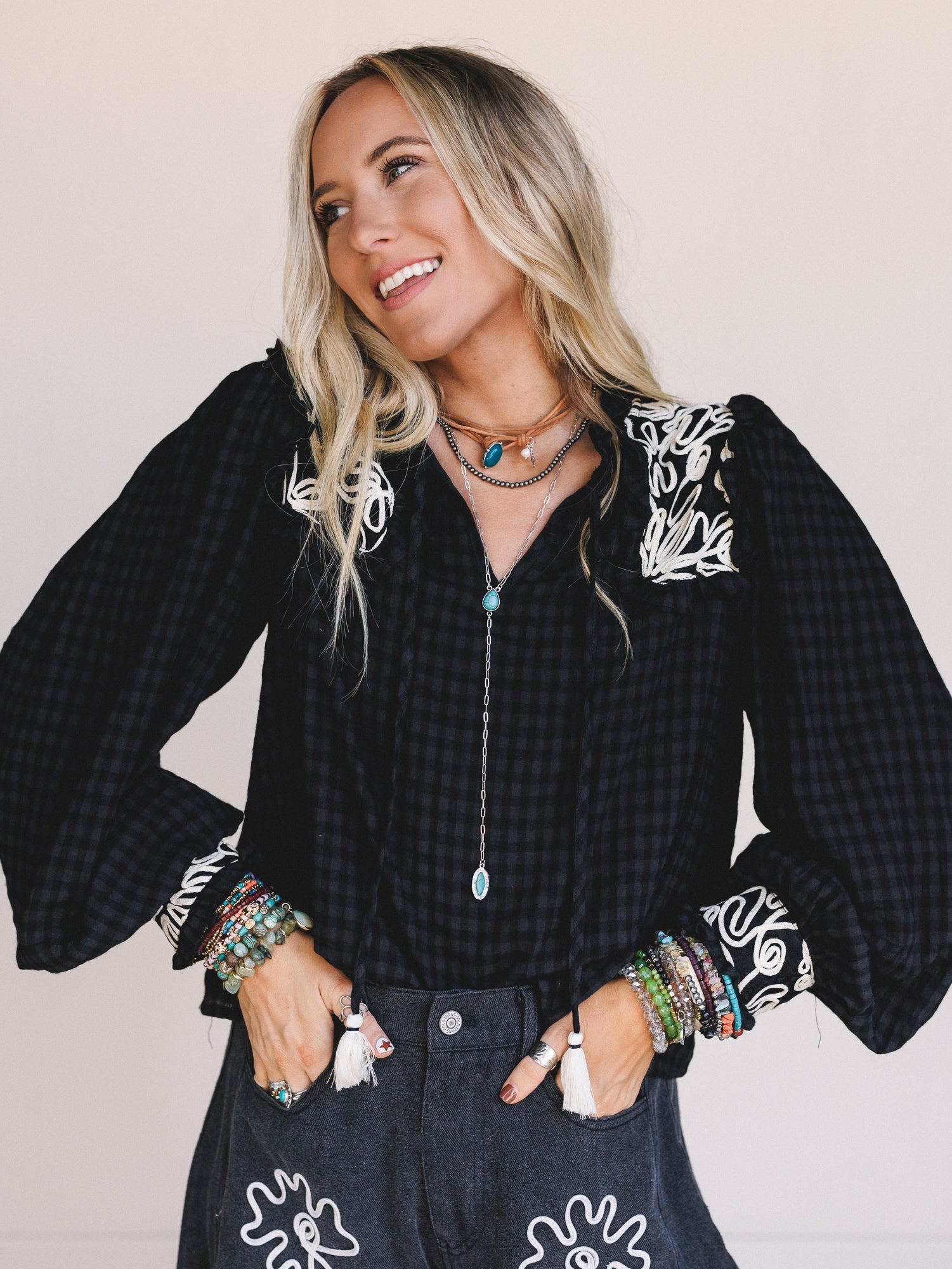 Wander into vintage charm with the Whisper Lane Top—a romantic piece that pairs heritage-inspired details with modern ease. Its soft checkered texture and intricate embroidery make it the perfect blend of quiet beauty and standout style.